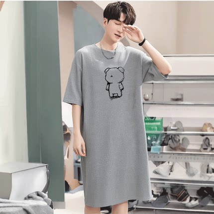 100%纯棉短袖睡衣夏季中长款家居服男款一体式高级感休闲卡通睡袍