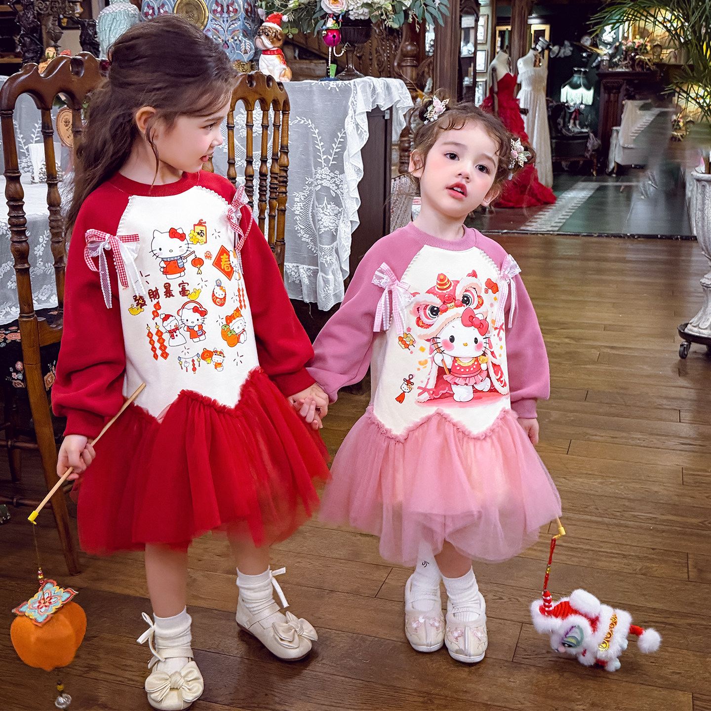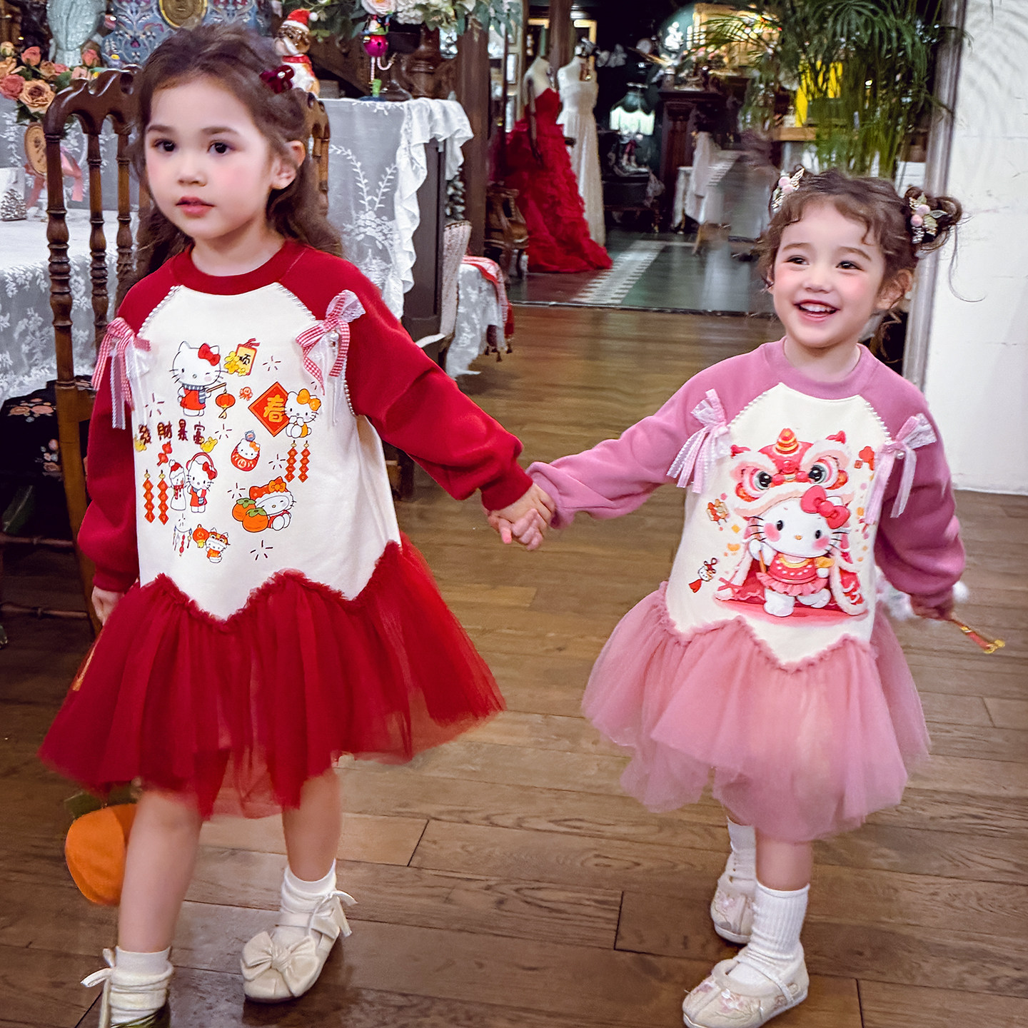 米米哈罗女童连衣裙冬装2025新款儿童加绒卫衣裙小女孩网纱公主裙