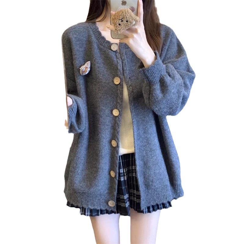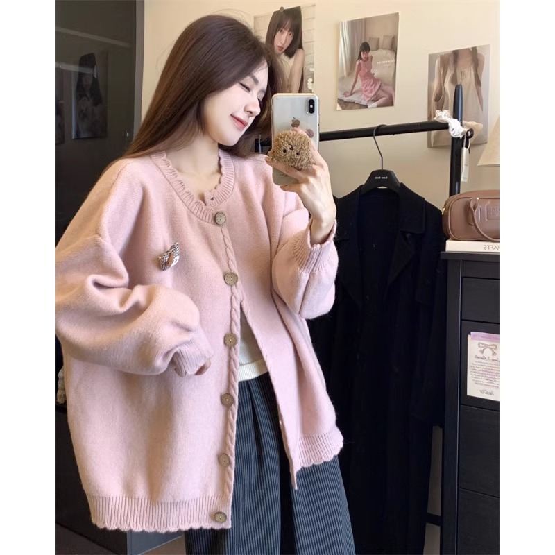 美拉德咖色针织开衫小熊毛衣外套女2025秋新款大码胖mm长款上衣