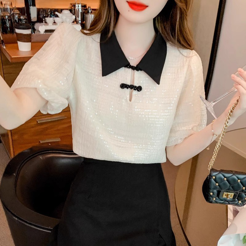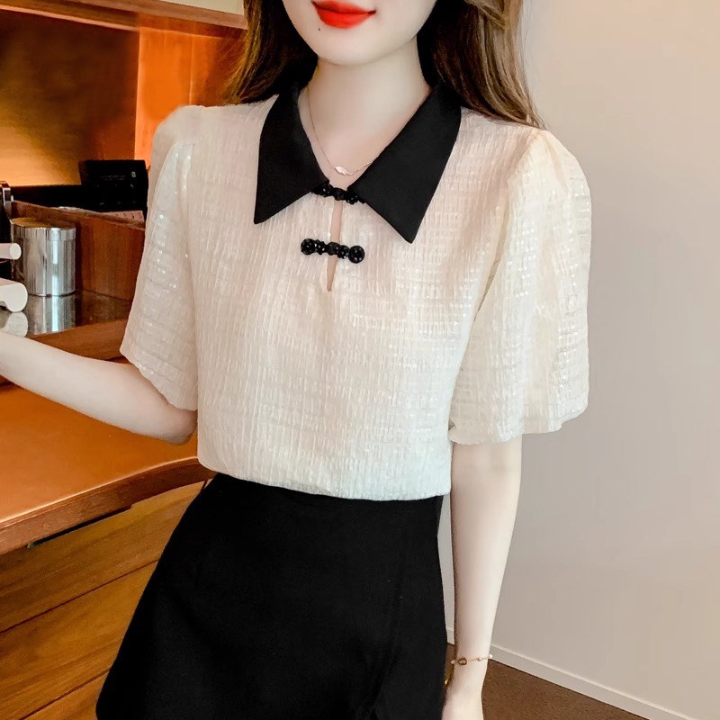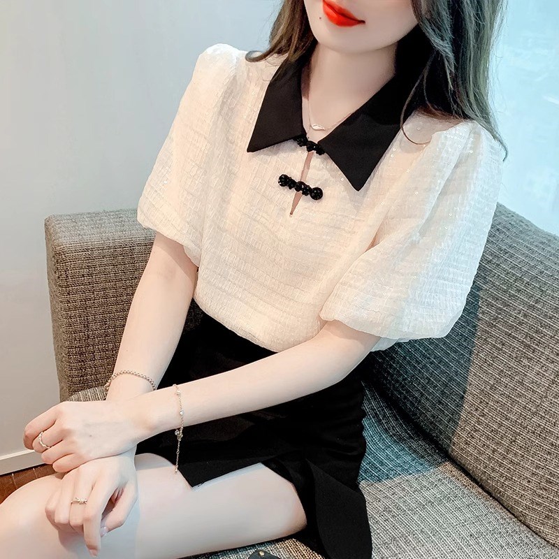 短袖衬衫女夏季2025年新款国风盘扣小衫设计感撞色翻领雪纺衫上衣
