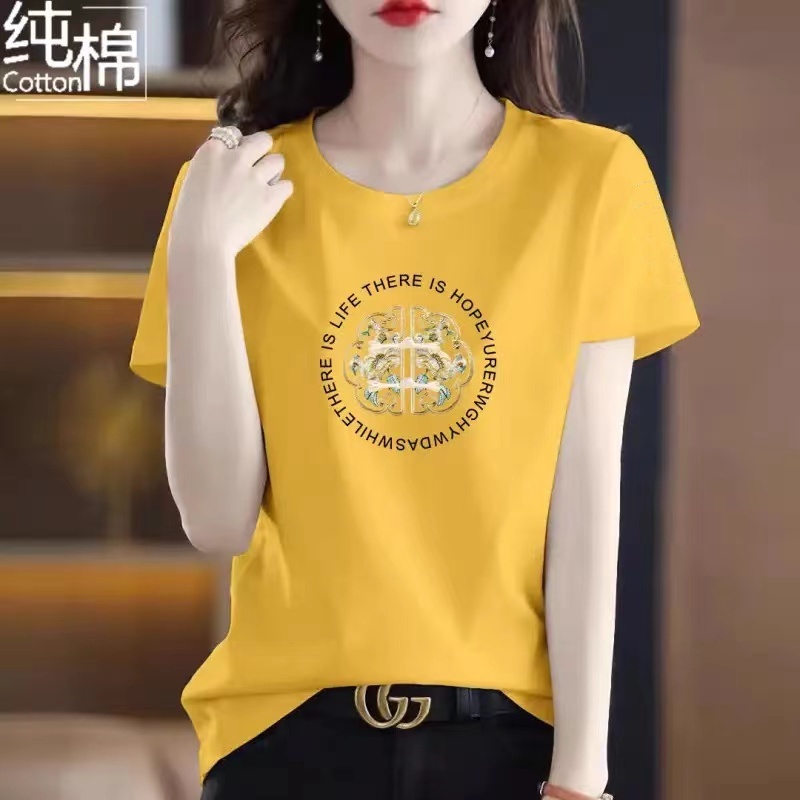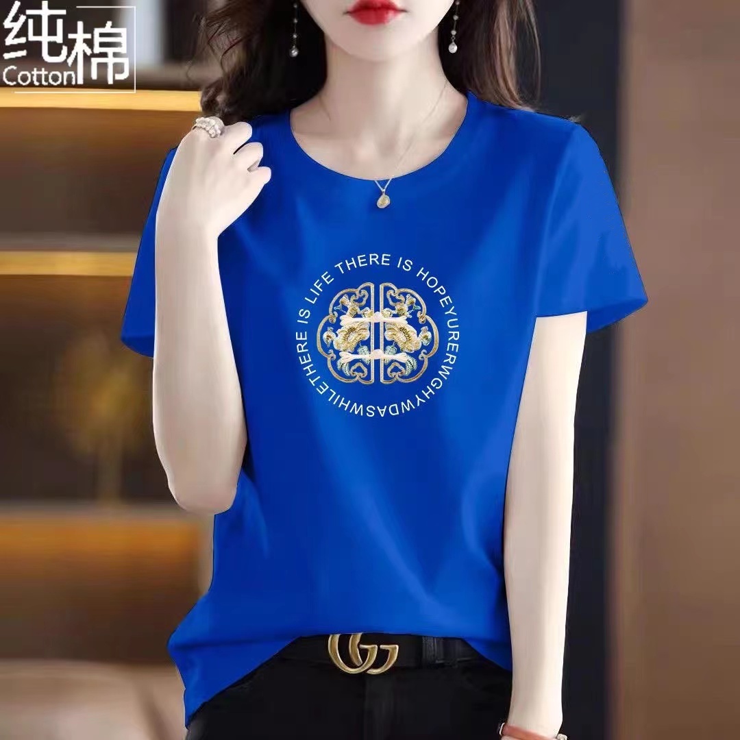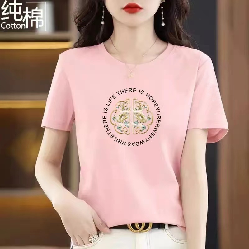 2025新中式国风正肩圆领短袖t恤女夏季宽松纯棉洋气体恤半袖上衣
