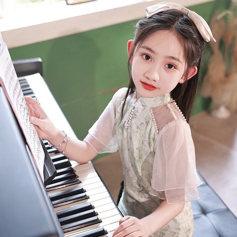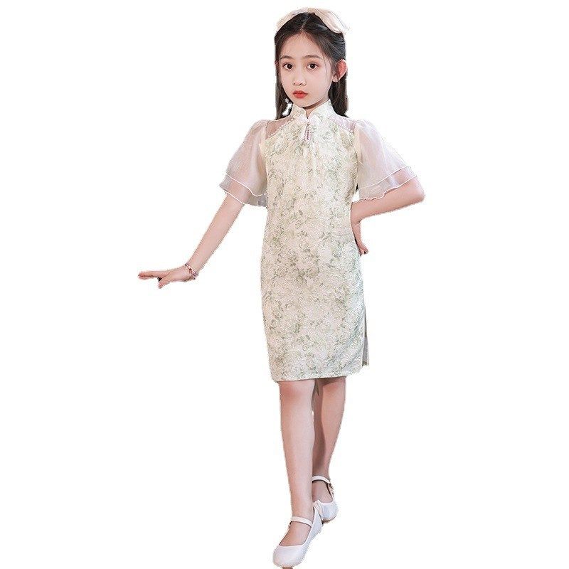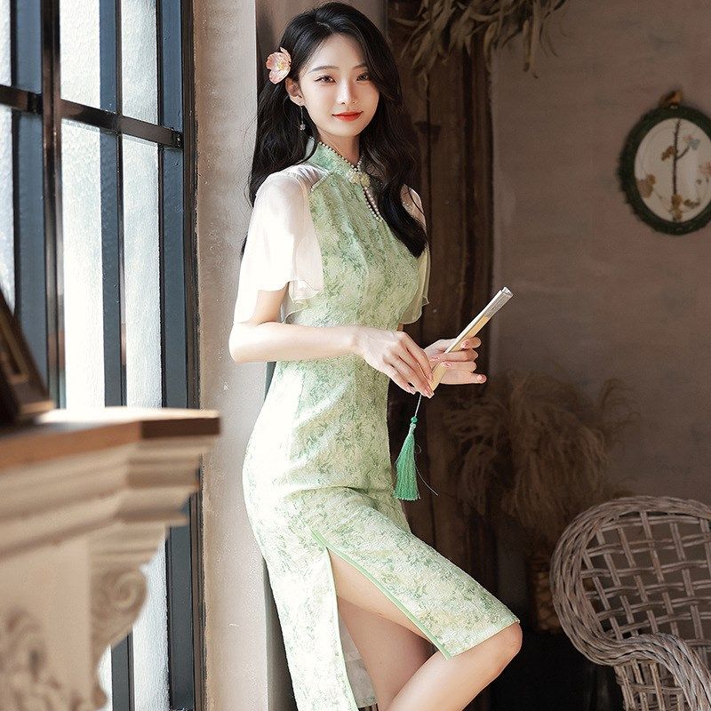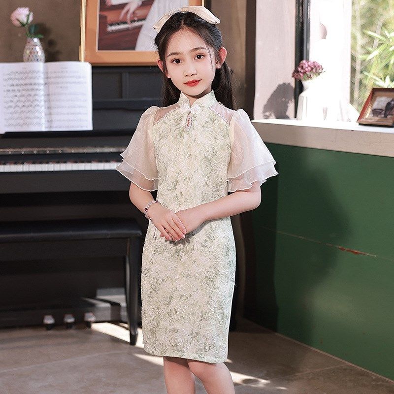 2024亲子旗袍母女装夏洋气高开叉女童连衣裙修身显瘦一模一样蕾丝