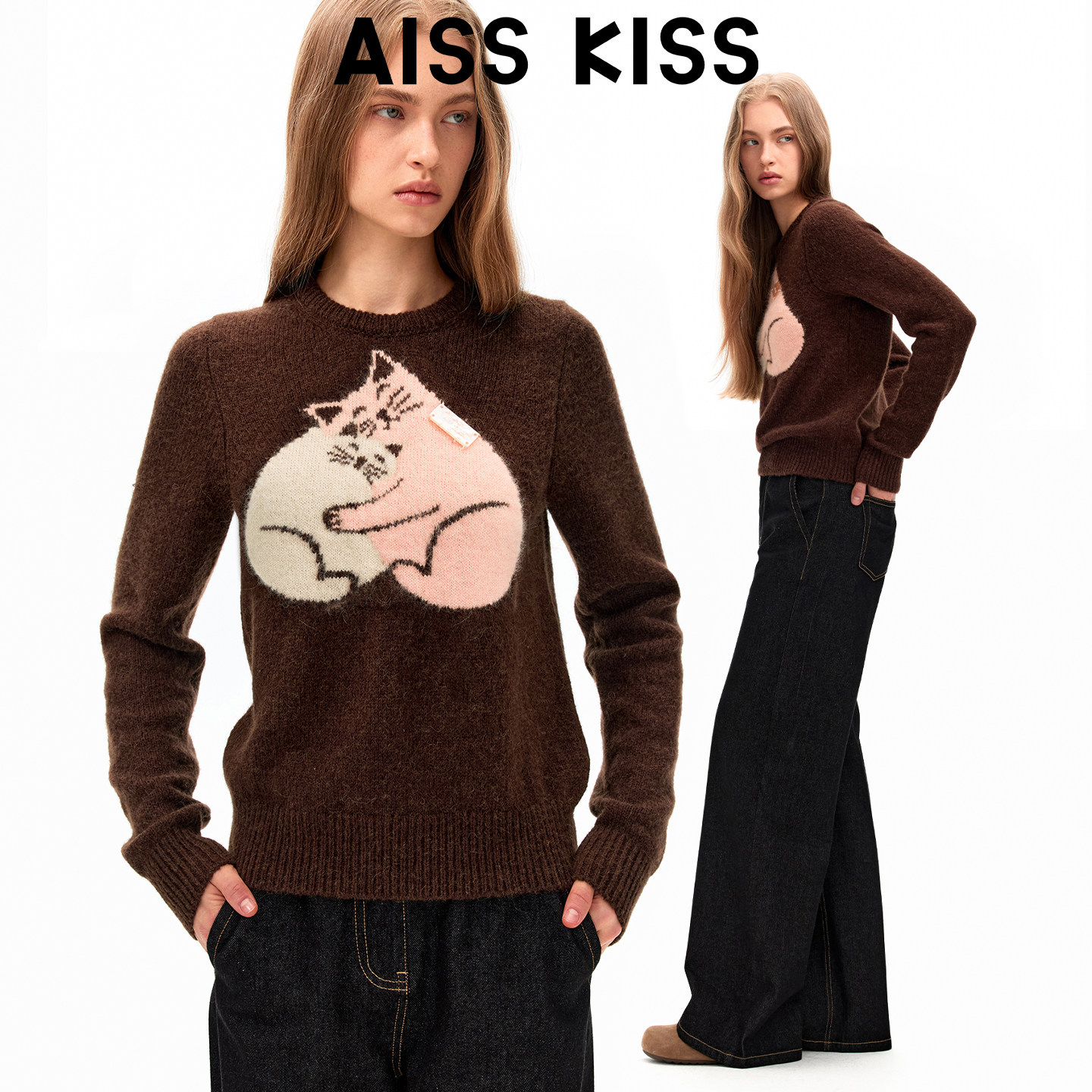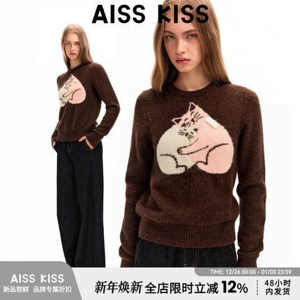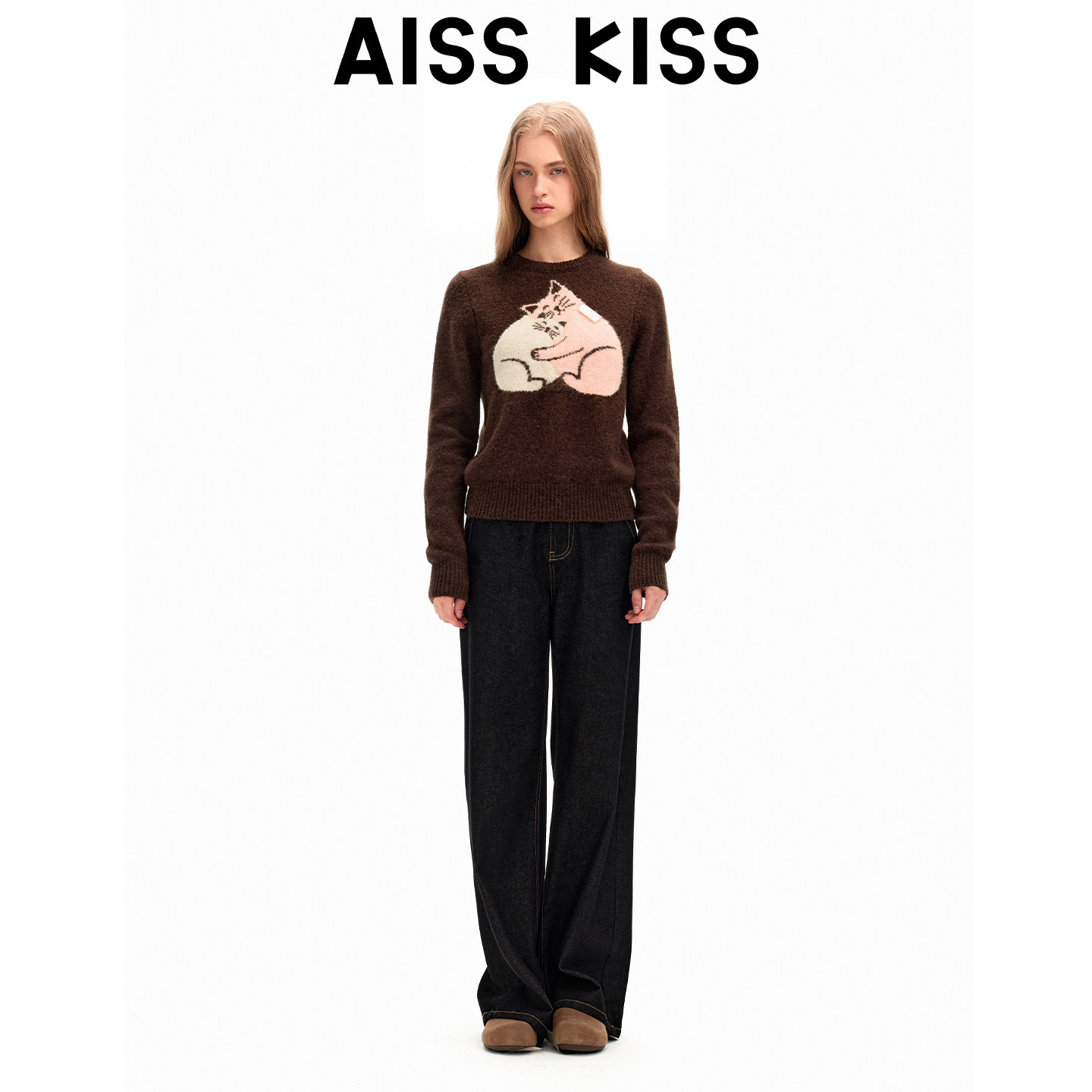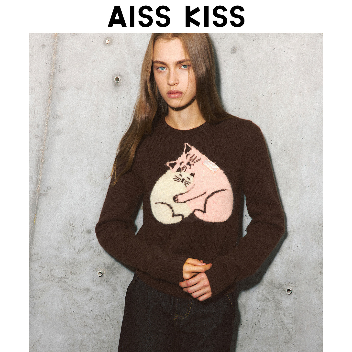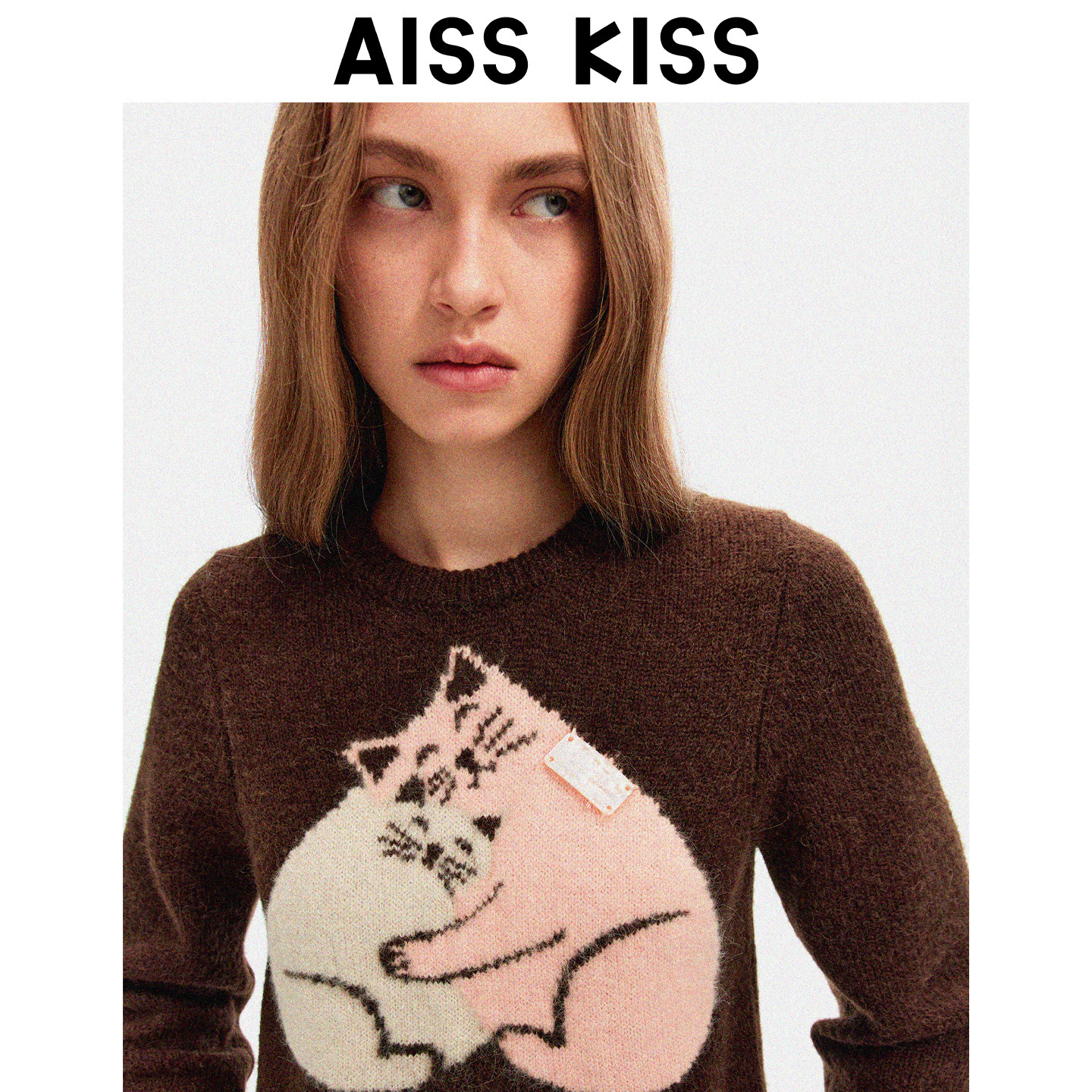 Aiss Kiss「胶囊」“拥抱猫”原创复古圆领羊驼毛套头咖色毛衣女