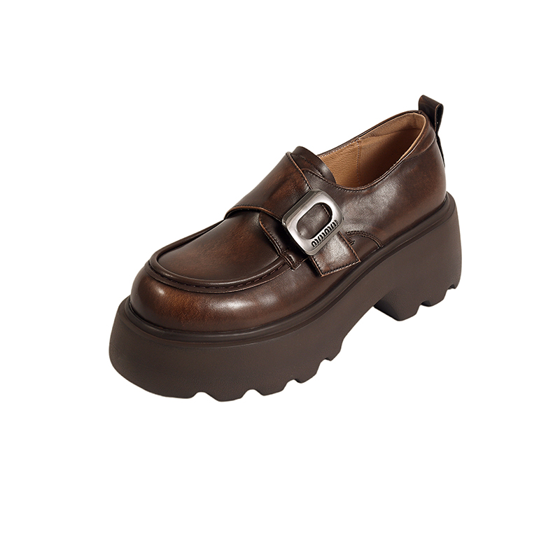 6cm松糕厚底扣带乐福鞋女2025新款春季一脚蹬小皮鞋真皮百搭单鞋