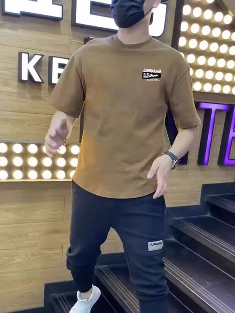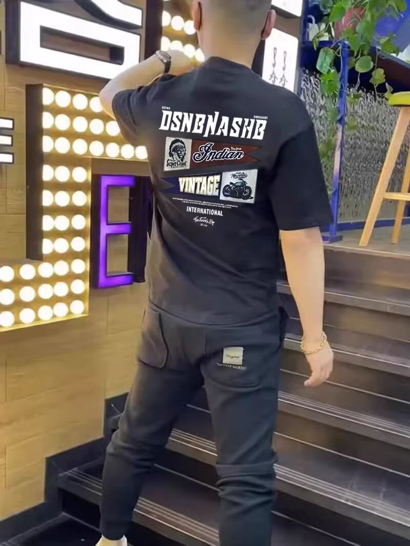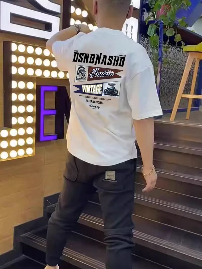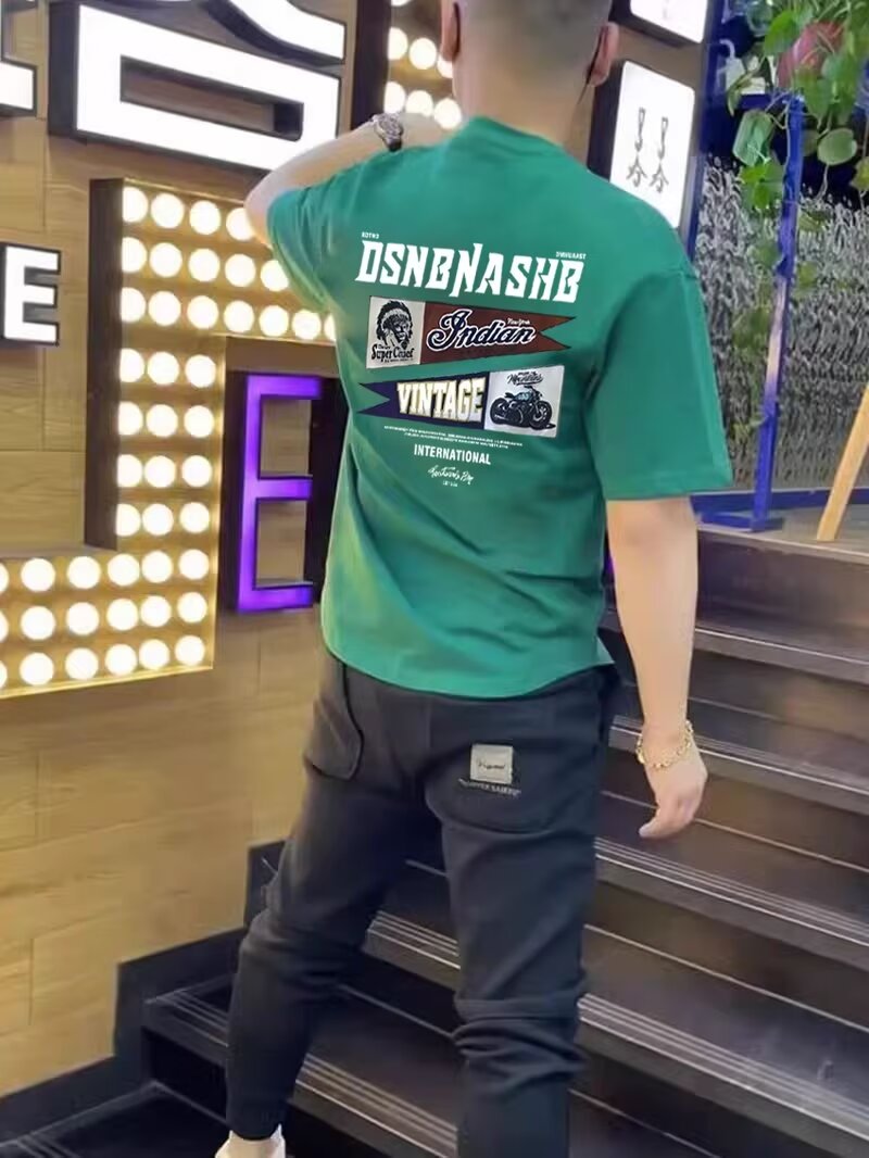 2025夏季新款男士短袖T恤时尚印花弧形不规则下摆圆领百搭半袖男