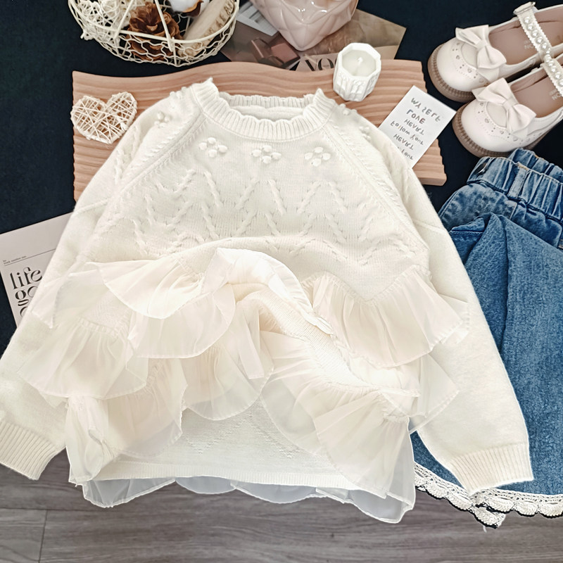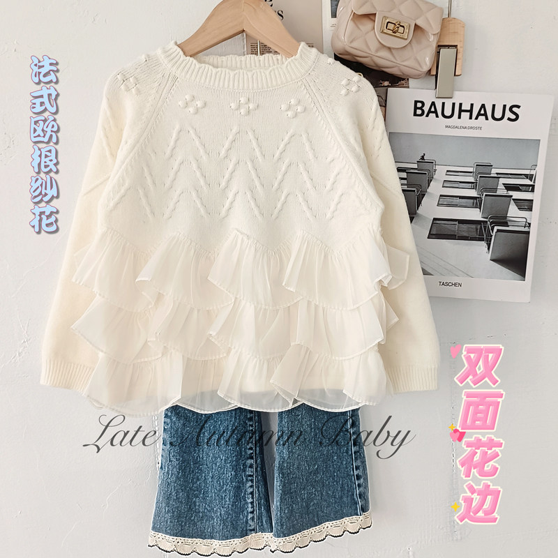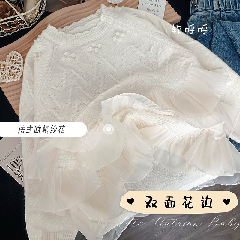 网红秋冬女童欧根纱花边蕾丝毛衣
