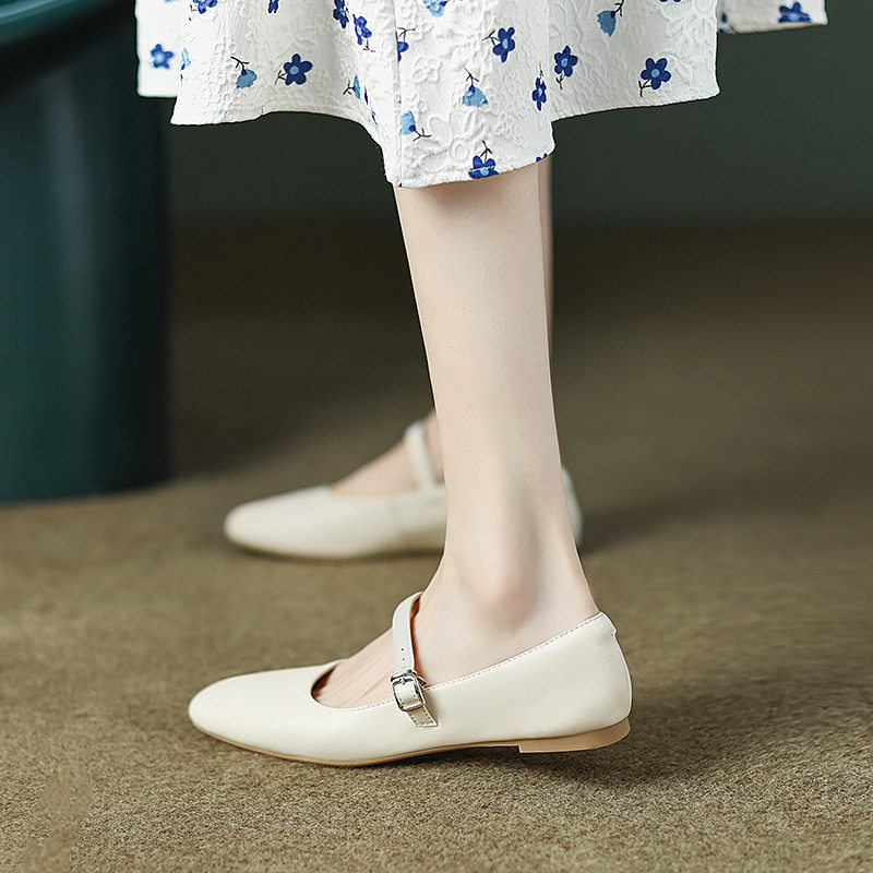 小码32 33 34码单鞋浅口平底百搭女鞋银色方头真皮一字扣玛丽珍鞋