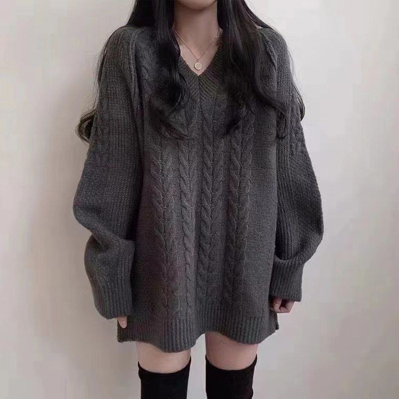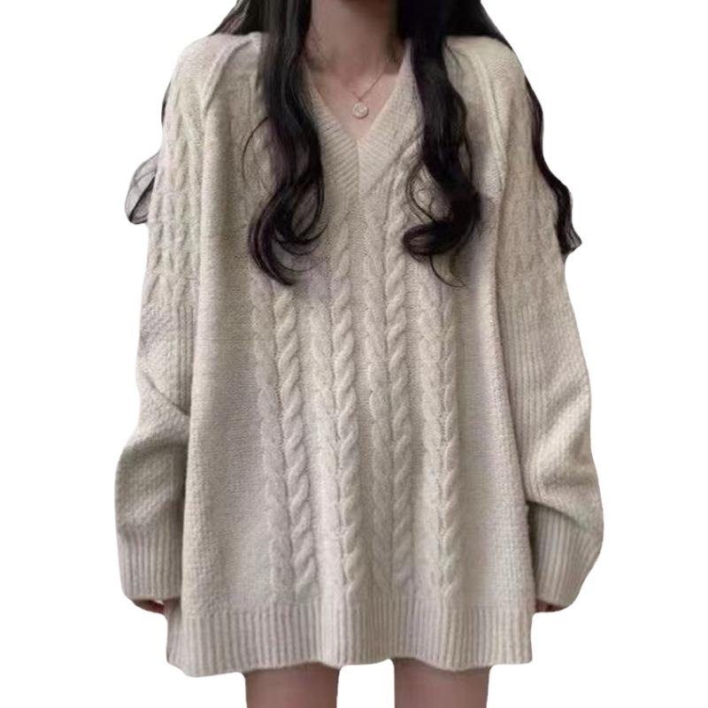 韩国chic秋款中长款麻花套头毛衣裙女洋气复古纯色百搭针织衫外贸