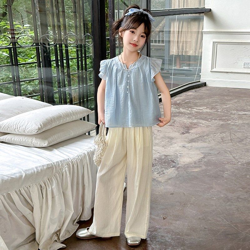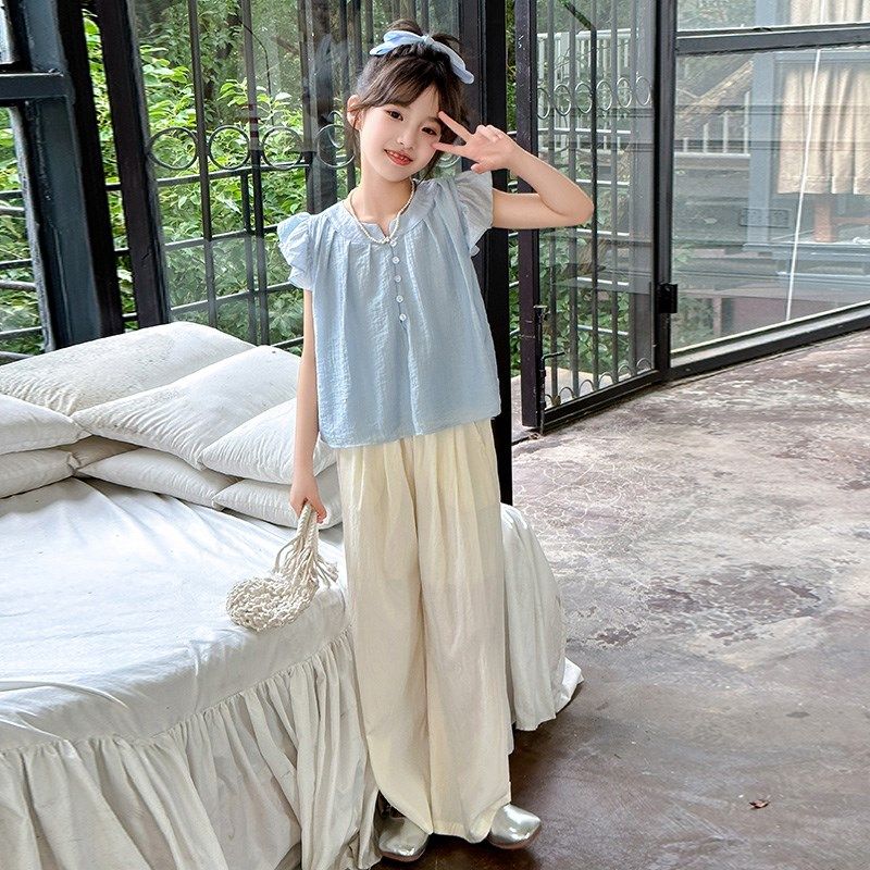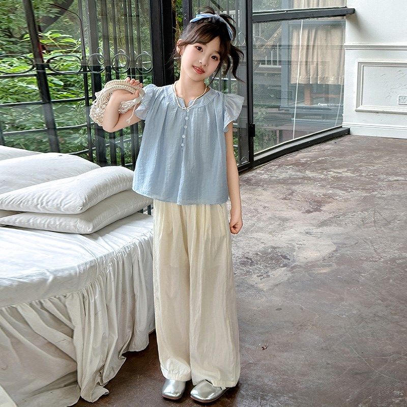 女童套装夏季2025新款儿童洋气飞袖上衣女大童夏装阔腿裤两件套潮