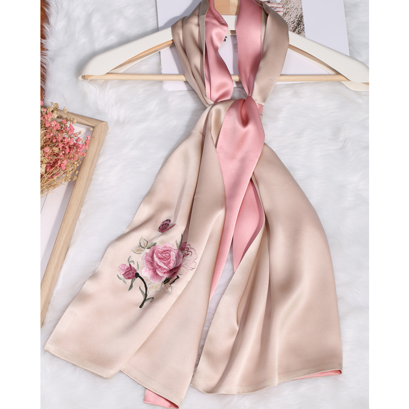 真丝丝巾女桑蚕丝春秋季高级手工刺绣配旗袍外搭苏绣丝绸围巾