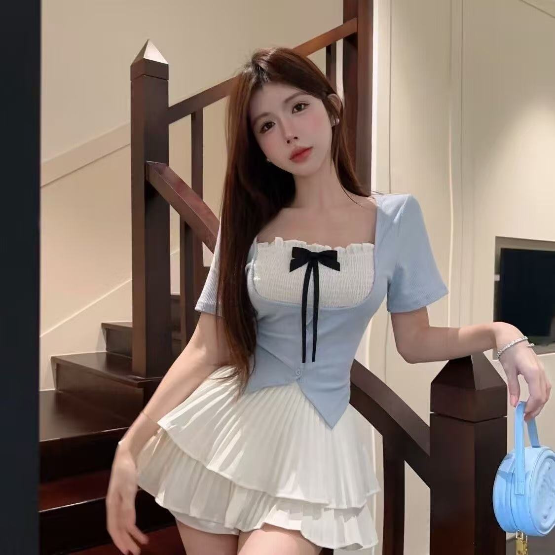 美式别致甜辣妹百褶裙子套装女夏季修身显瘦减龄时髦学院风两件套