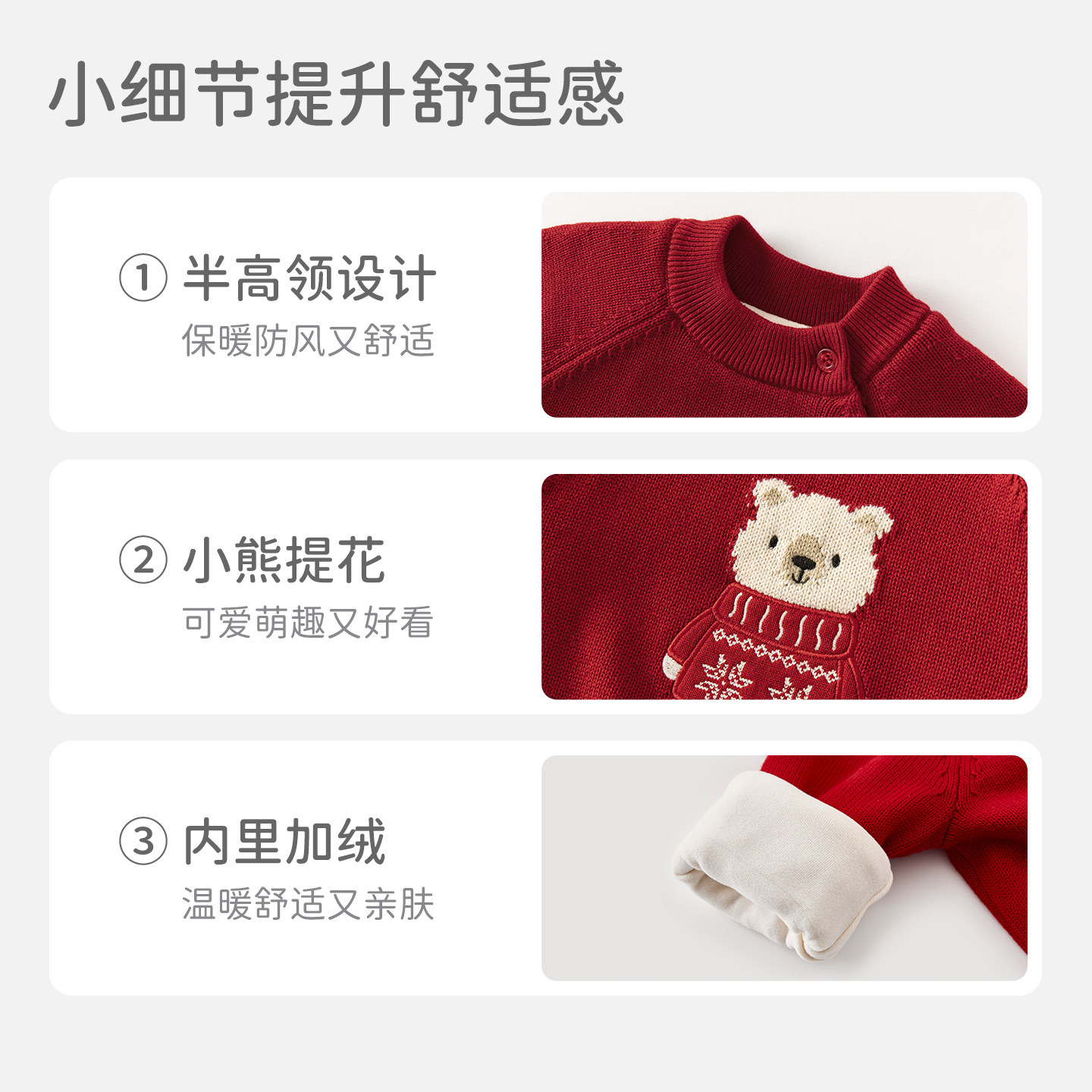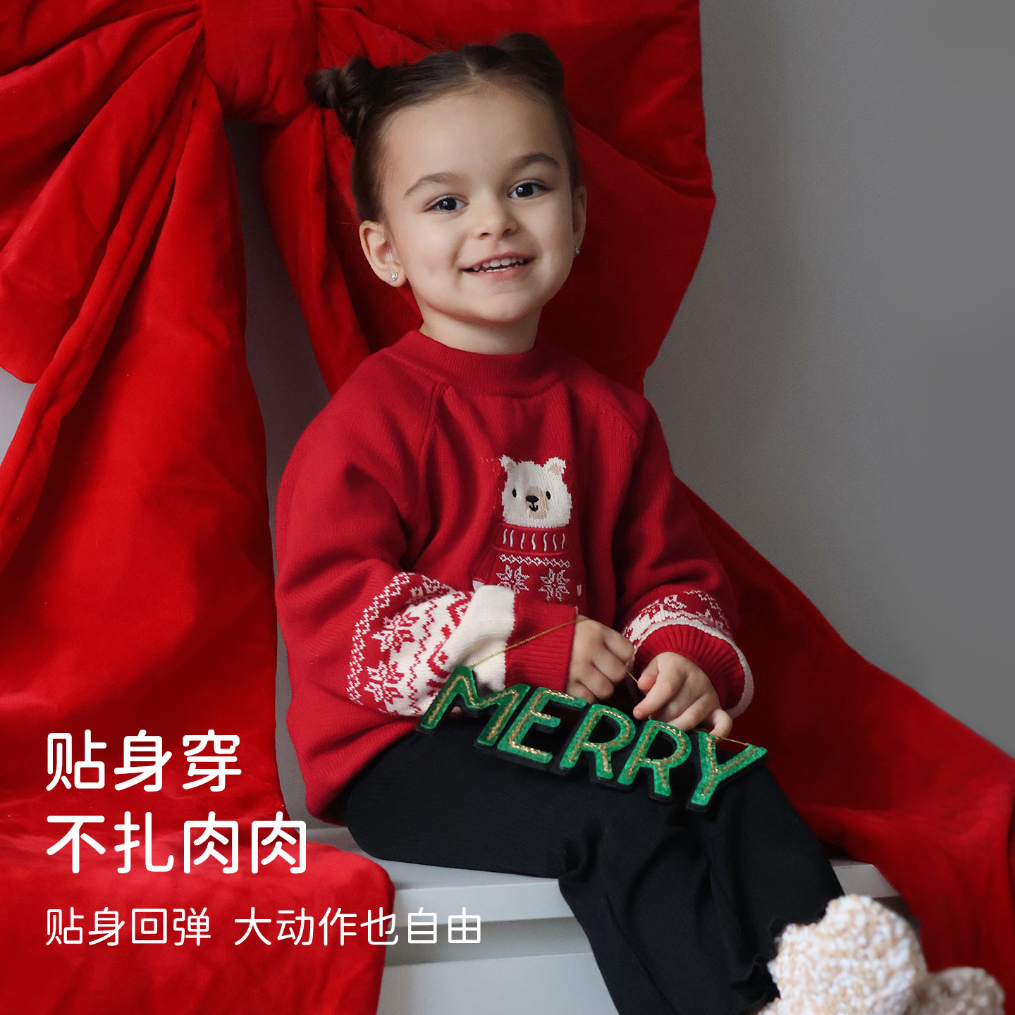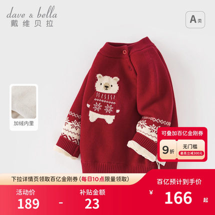 戴维贝拉儿童半高领红色毛衣保暖冬男女童新年上衣加绒圣诞针织衫