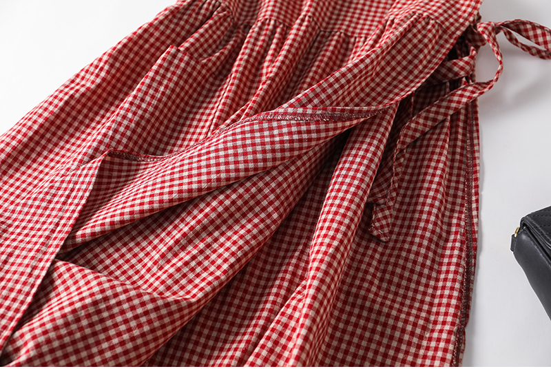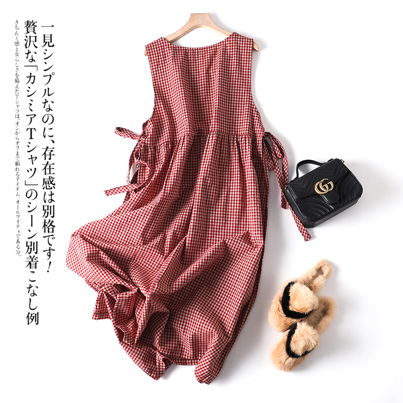 外贸原单日系森女文艺叠穿背心裙日式工装棉麻格子罩裙绑带连衣裙