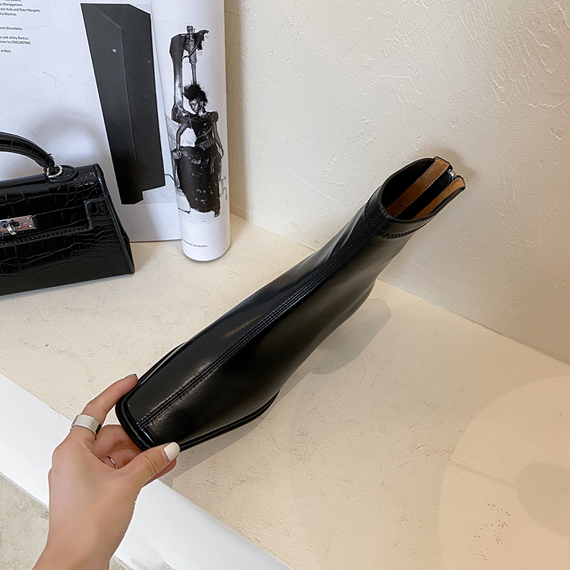 佑泽方头白色中跟粗跟瘦瘦靴2025秋冬单靴米色拉链高跟弹力短靴女