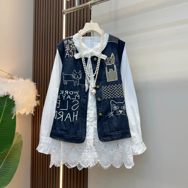 卡通图案字母牛仔马甲蕾丝打底衫