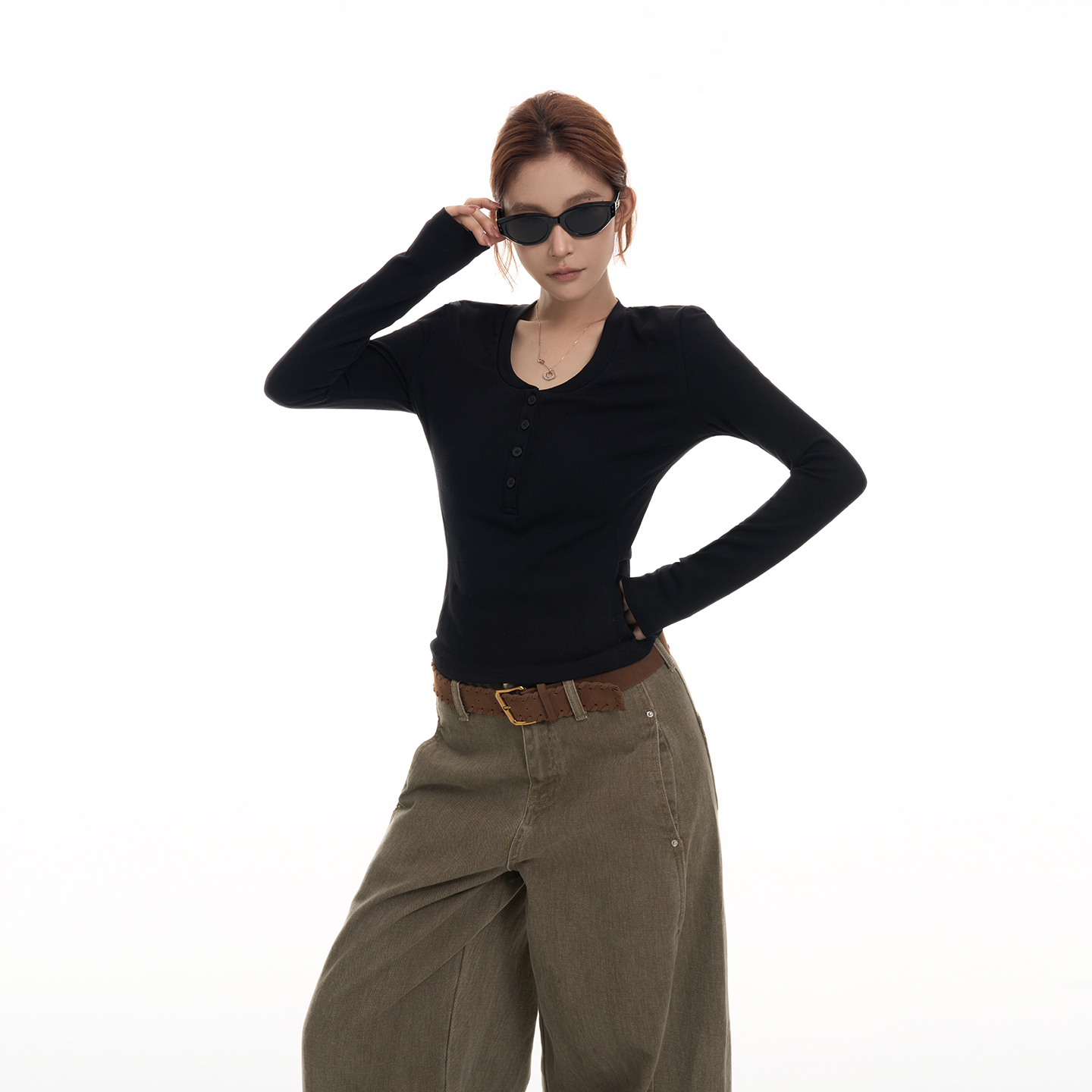 吴童童正肩V领长袖内搭T恤