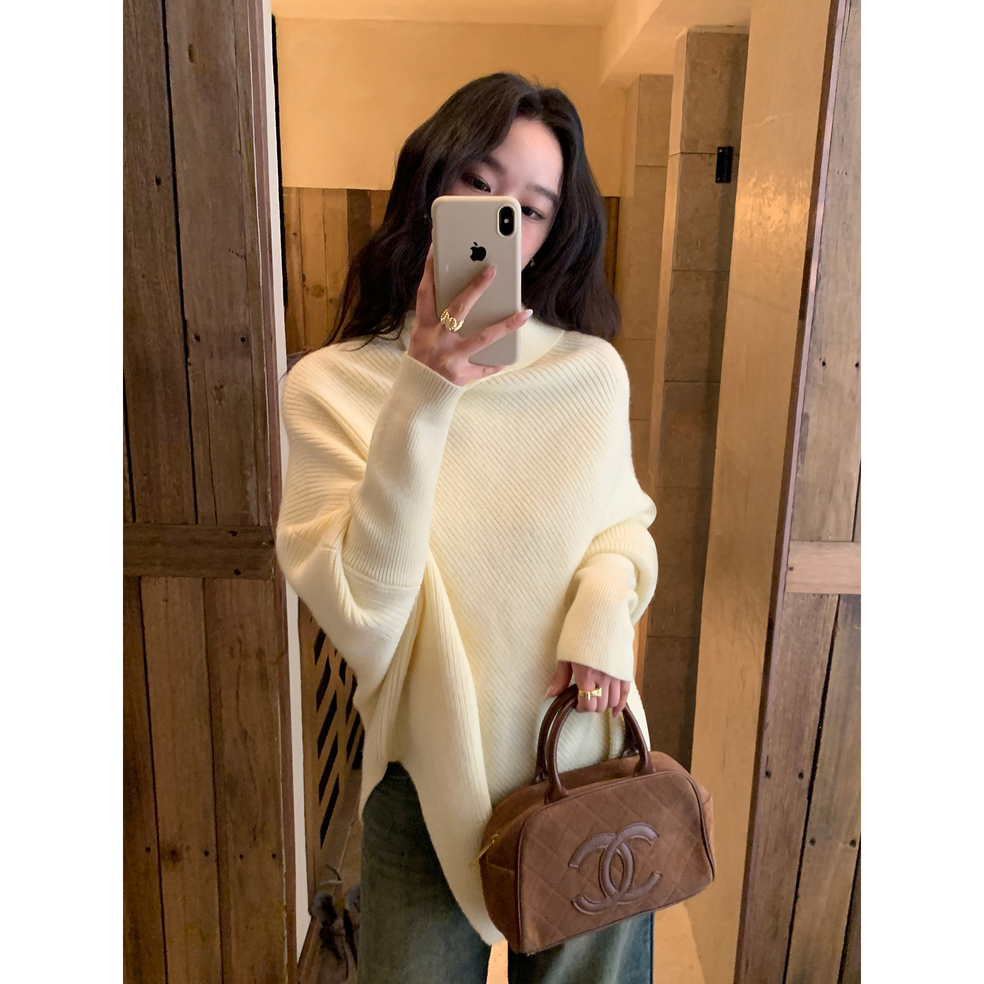 pusumede设计感蝙蝠袖毛衣女不规则翻领小众宽松气质斗篷针织上衣