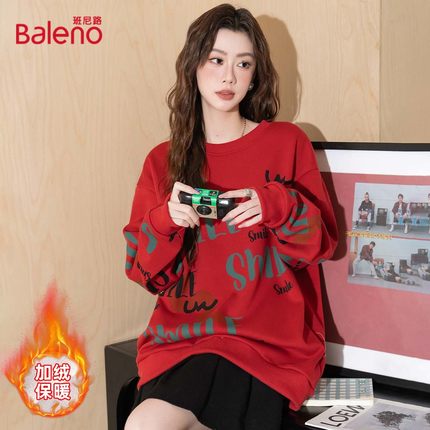 班尼路加绒加厚女式圆领卫衣秋冬保暖舒适宽松简约休闲印花上衣J