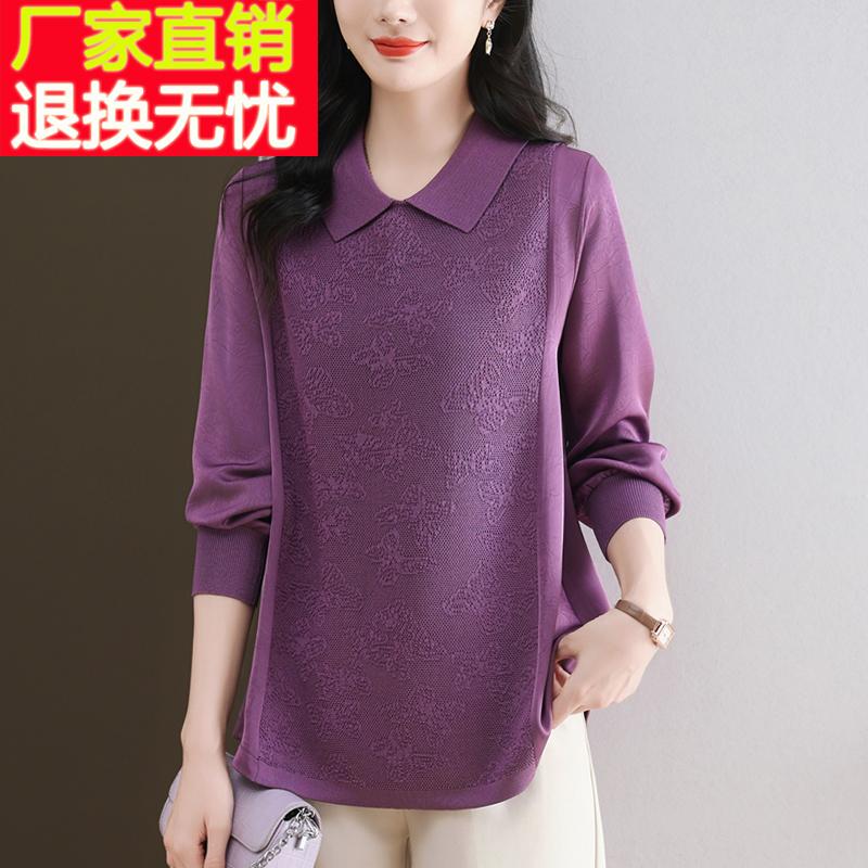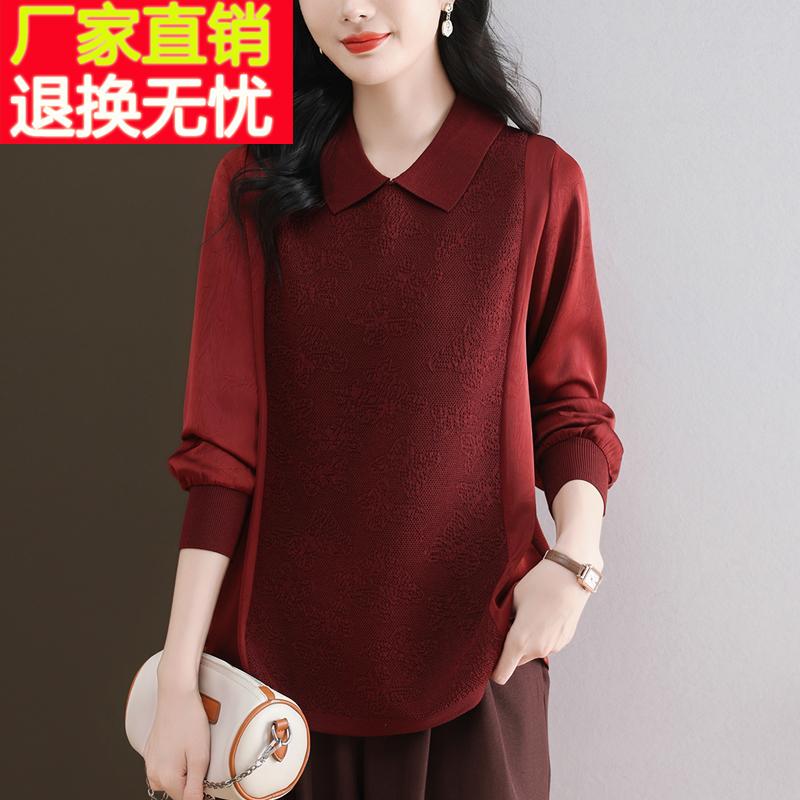 中年妈妈春秋新款洋气上衣拼接针织衫女宽松加肥大码衬衫长袖T恤