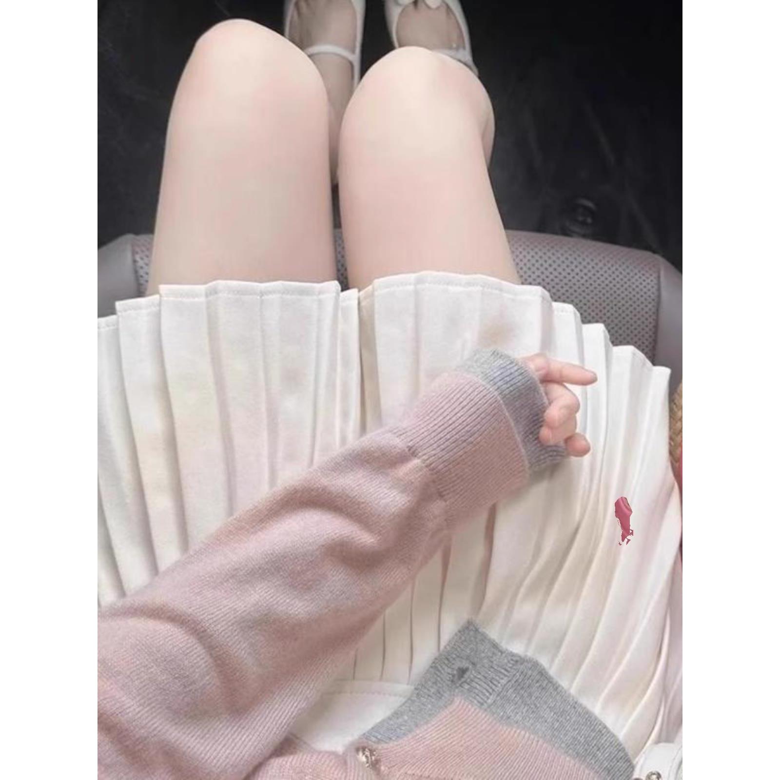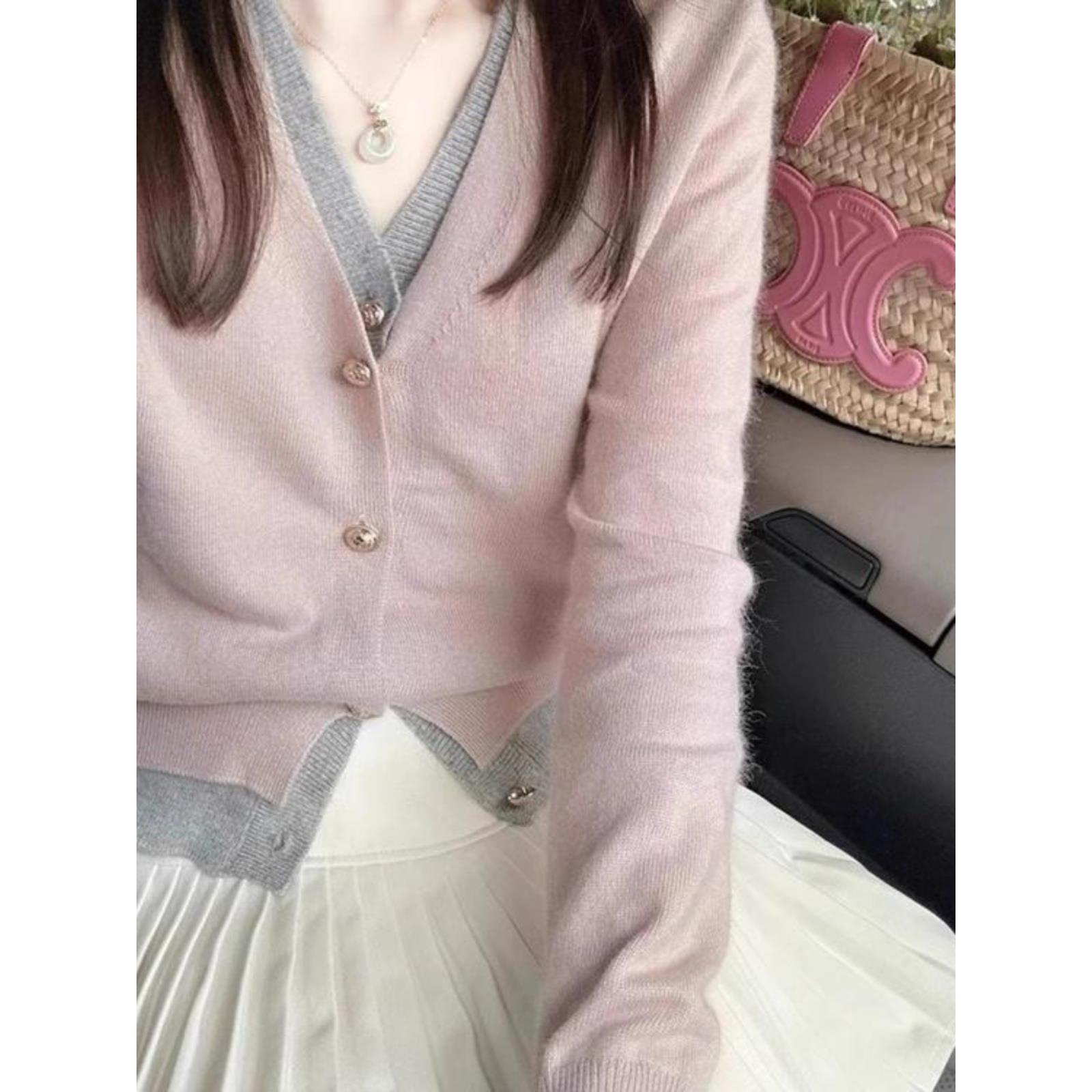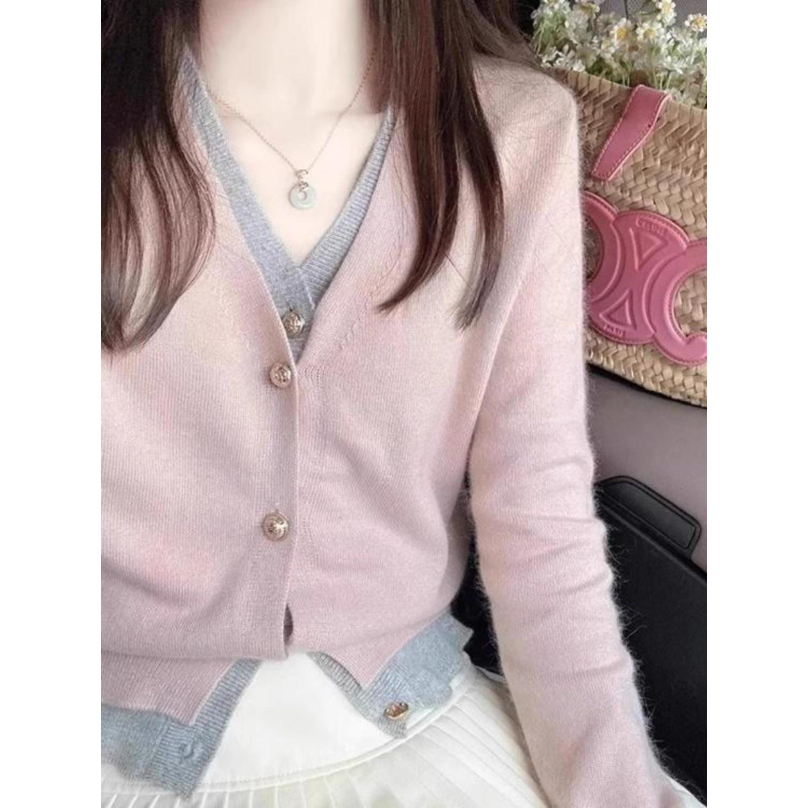 韩系小香风假两件粉色v领针织开衫女春秋设计感短款毛衣外套上衣