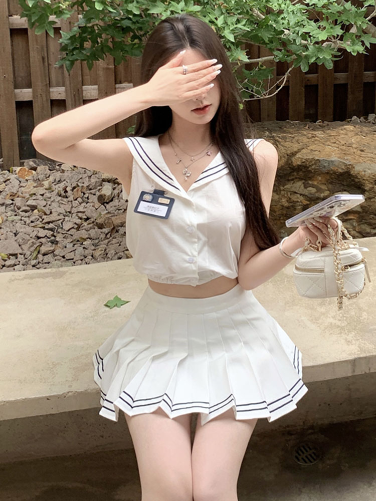 2023年夏季新款时尚海军风JK套装女无袖娃娃领减龄衬衫+百褶短裙