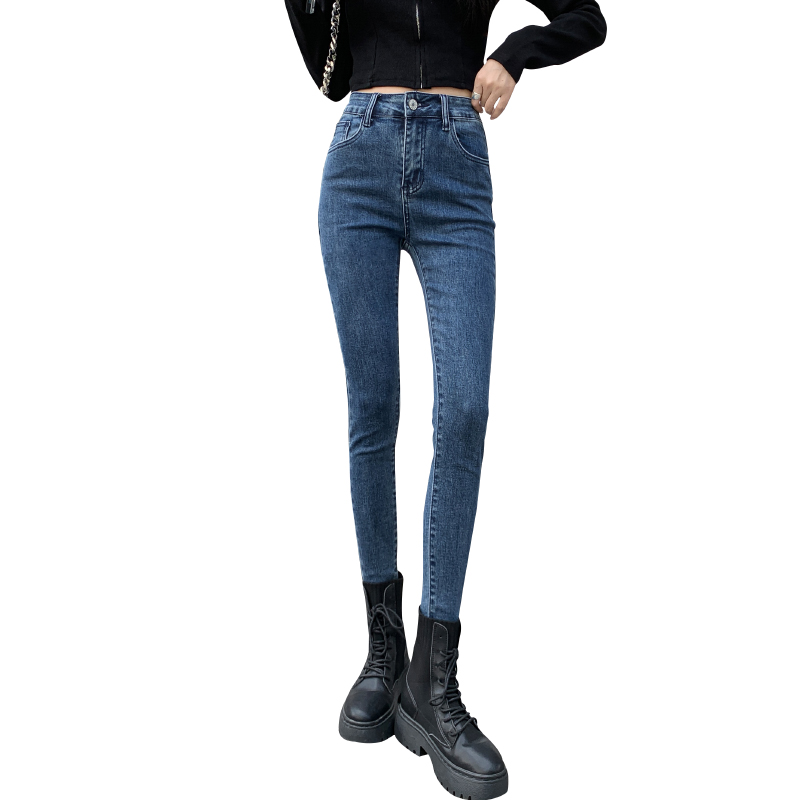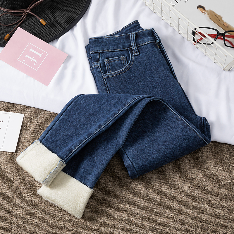 矮小个子搭配靴子穿的毛边加绒小脚牛仔裤女秋冬装薄绒九分铅笔裤