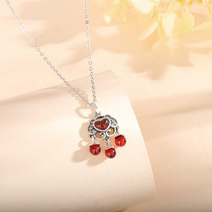 s925纯银长命锁项链女红色石榴石民族风流苏圆珠锁骨链平安锁吊坠