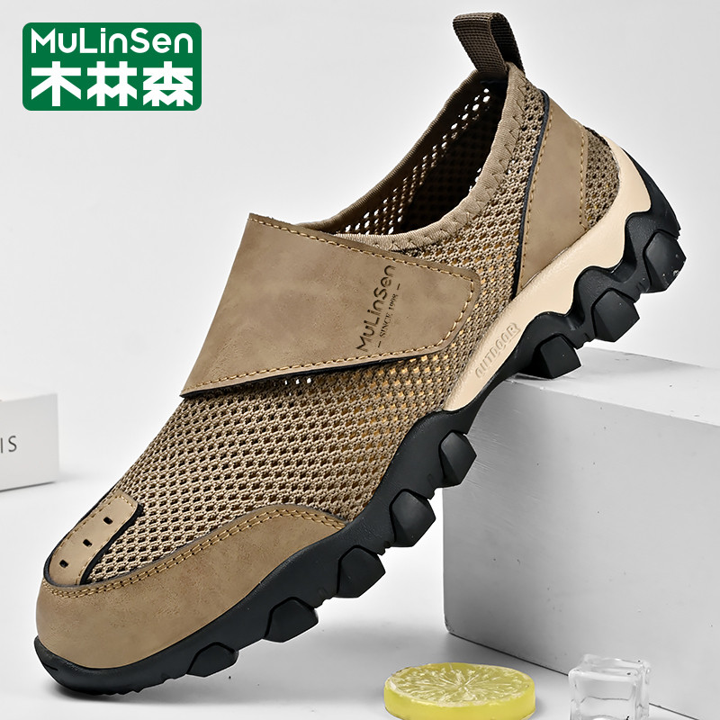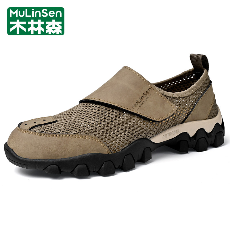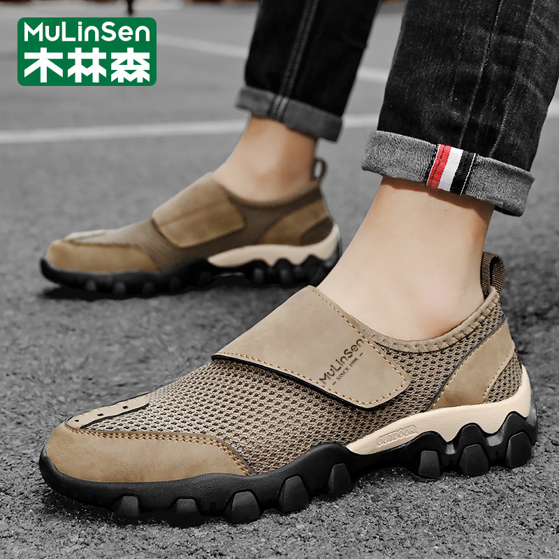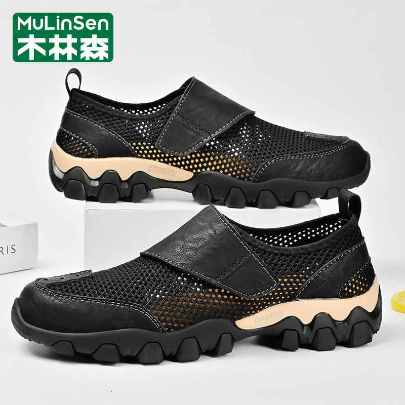 木林森网鞋男夏季运动休闲网眼镂空透气包头魔术贴户外登山老爹鞋