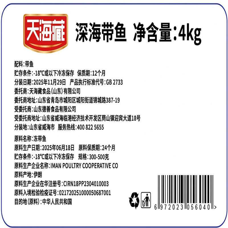 天海藏深海大带鱼礼盒9-11整条