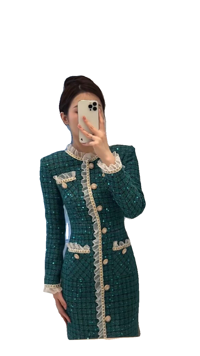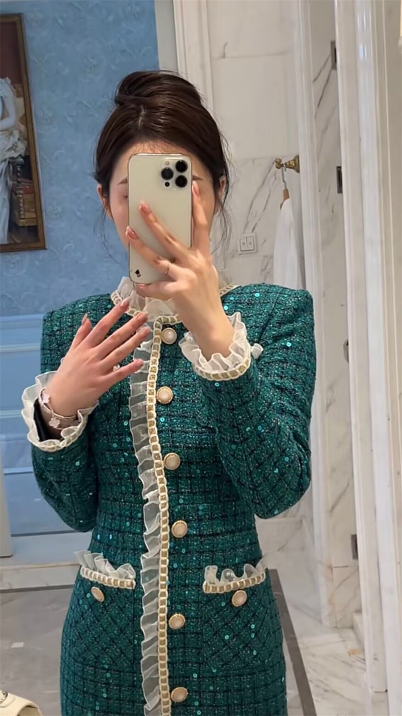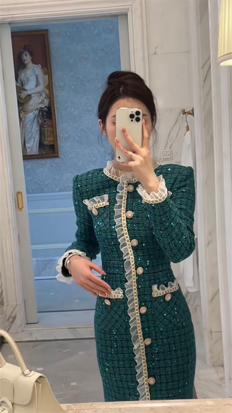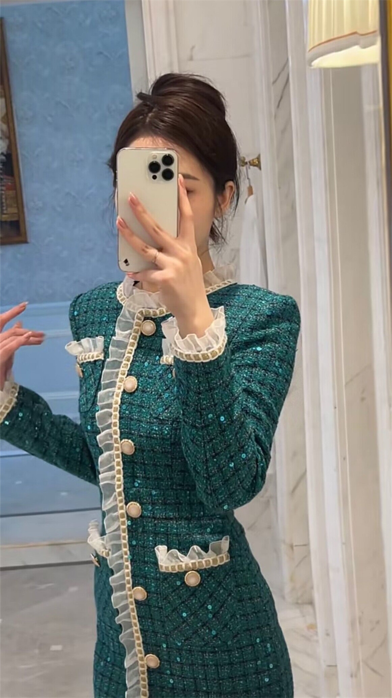 小香风爆款女装2023年秋季新款气质时尚显瘦菲边单排扣长袖连衣裙