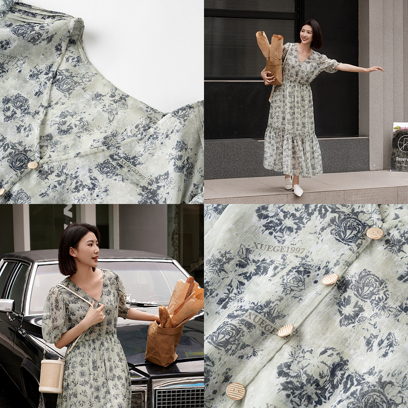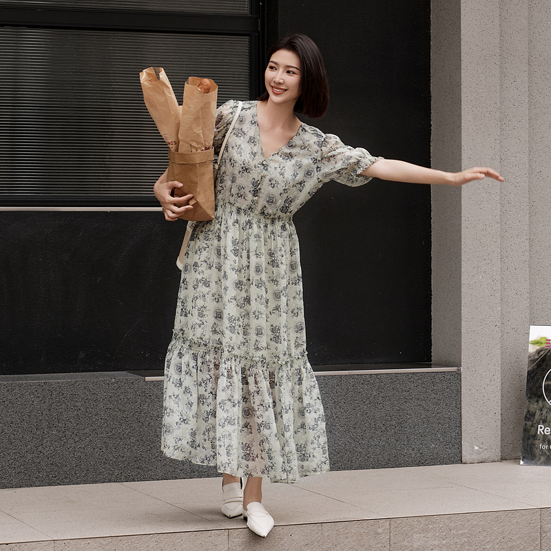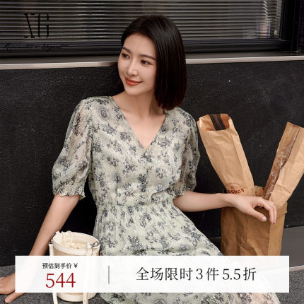XG雪歌高腰设计碎花短袖连衣裙2025夏季新款中长款套头A字裙女装
