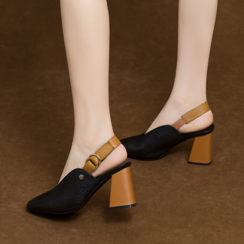 圣梵西粗跟包头高跟鞋真皮凉鞋