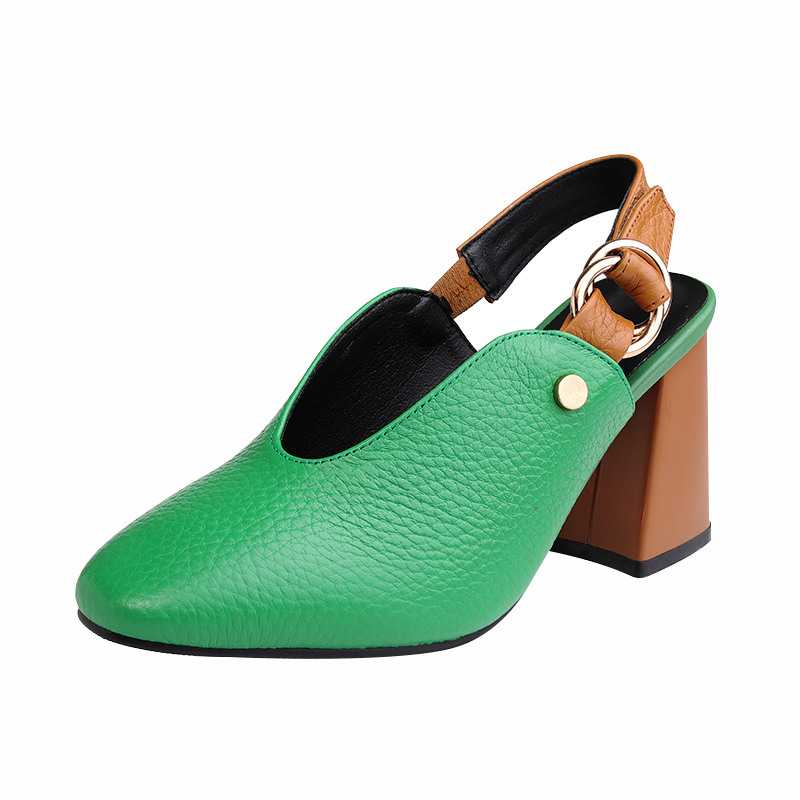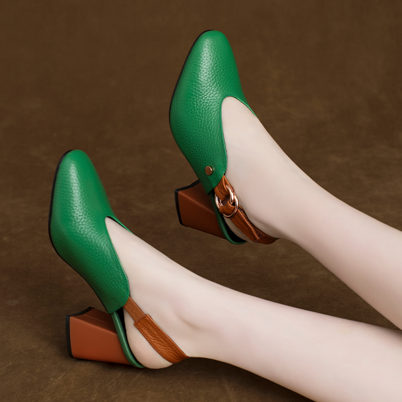 2025年新款绿色包头高跟鞋凉鞋女夏季复古粗跟软皮后空单鞋真皮鞋