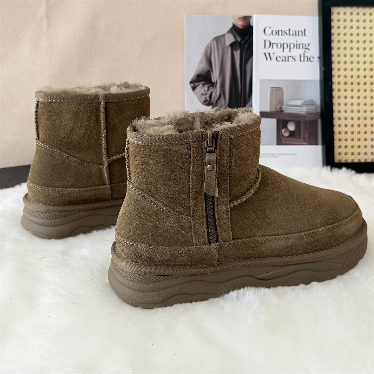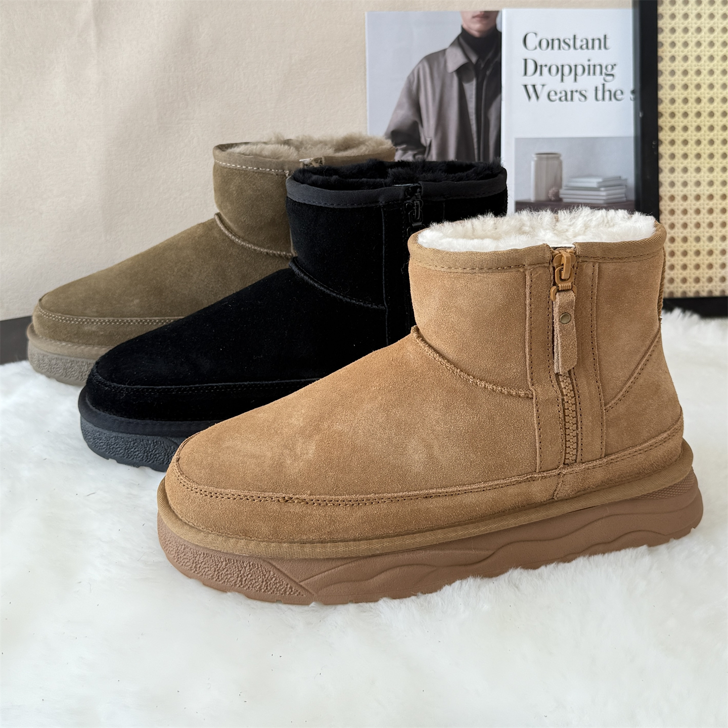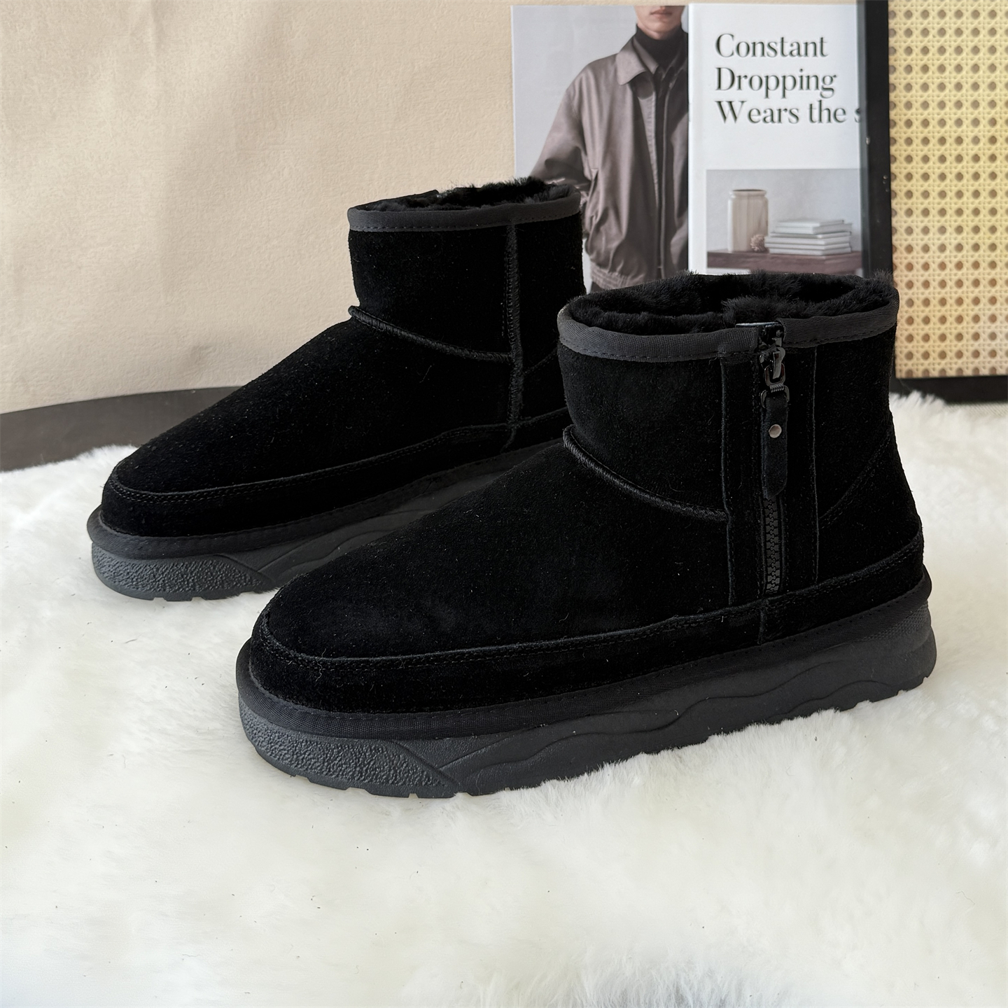磨砂牛皮加厚全羊毛雪地靴男靴短