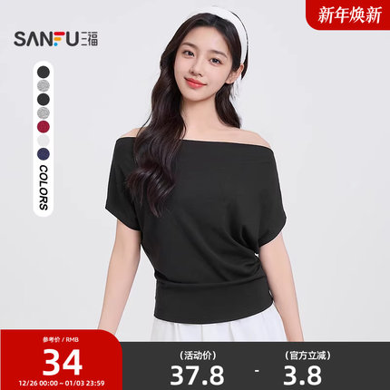 三福短袖T恤2025新款夏季气质一字肩褶皱收腰显瘦上衣女装498335