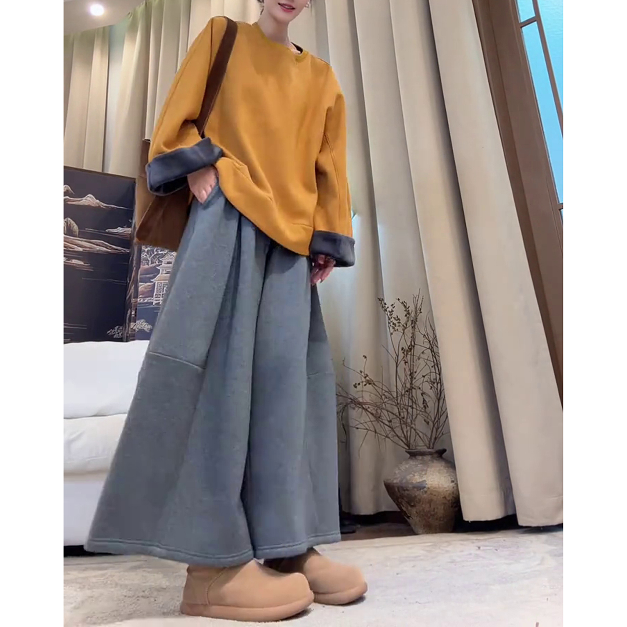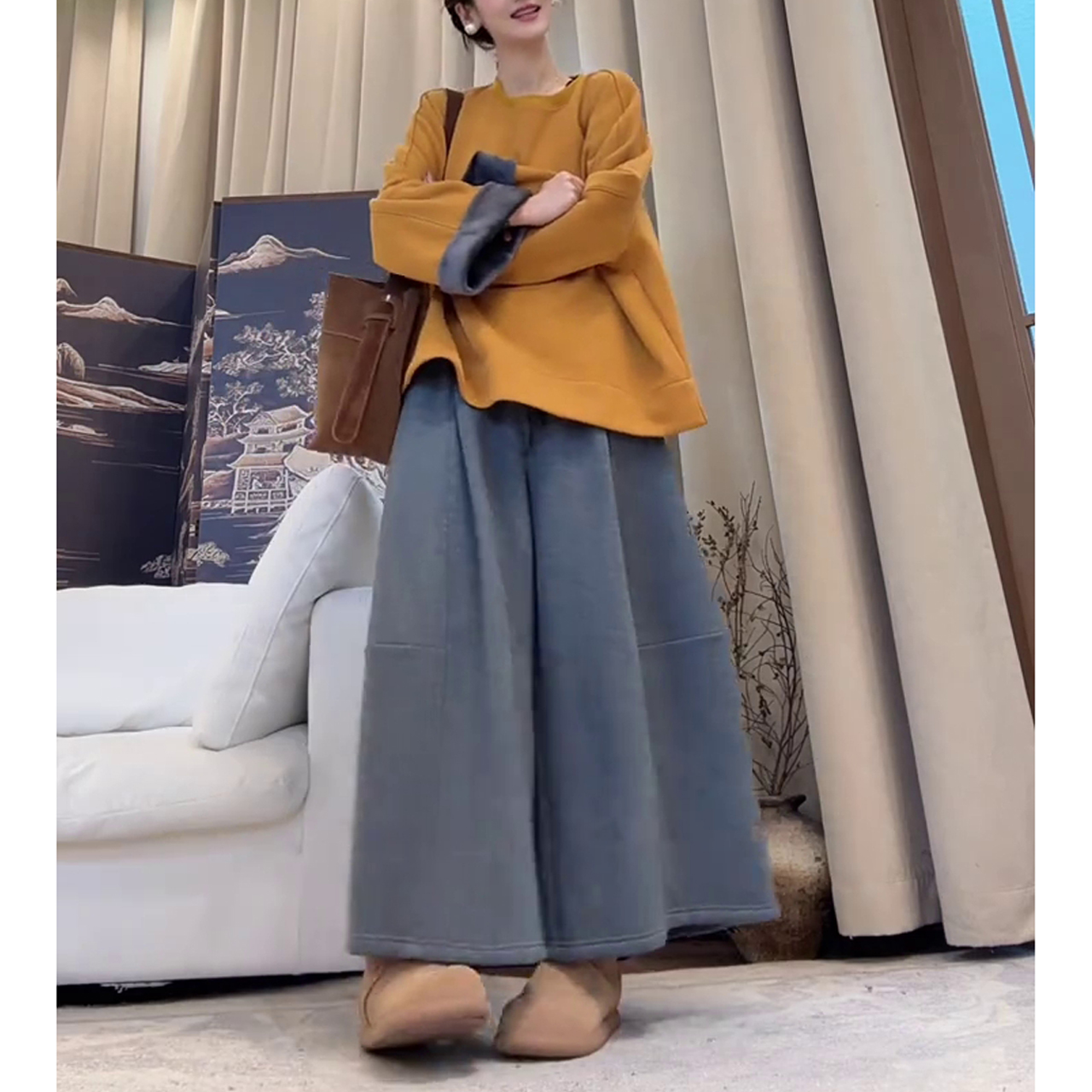 2025秋冬季新款宽松显瘦长袖卫衣松紧腰阔腿裙裤子加绒两件套装女