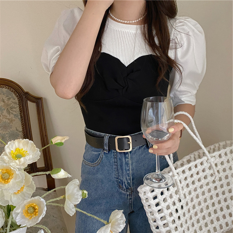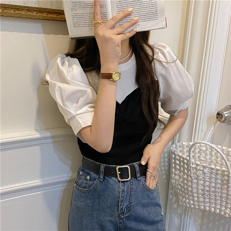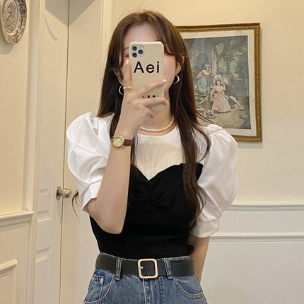 大码胖妹妹假两件泡泡短袖T恤女夏季新款修身显瘦设计感小众上衣