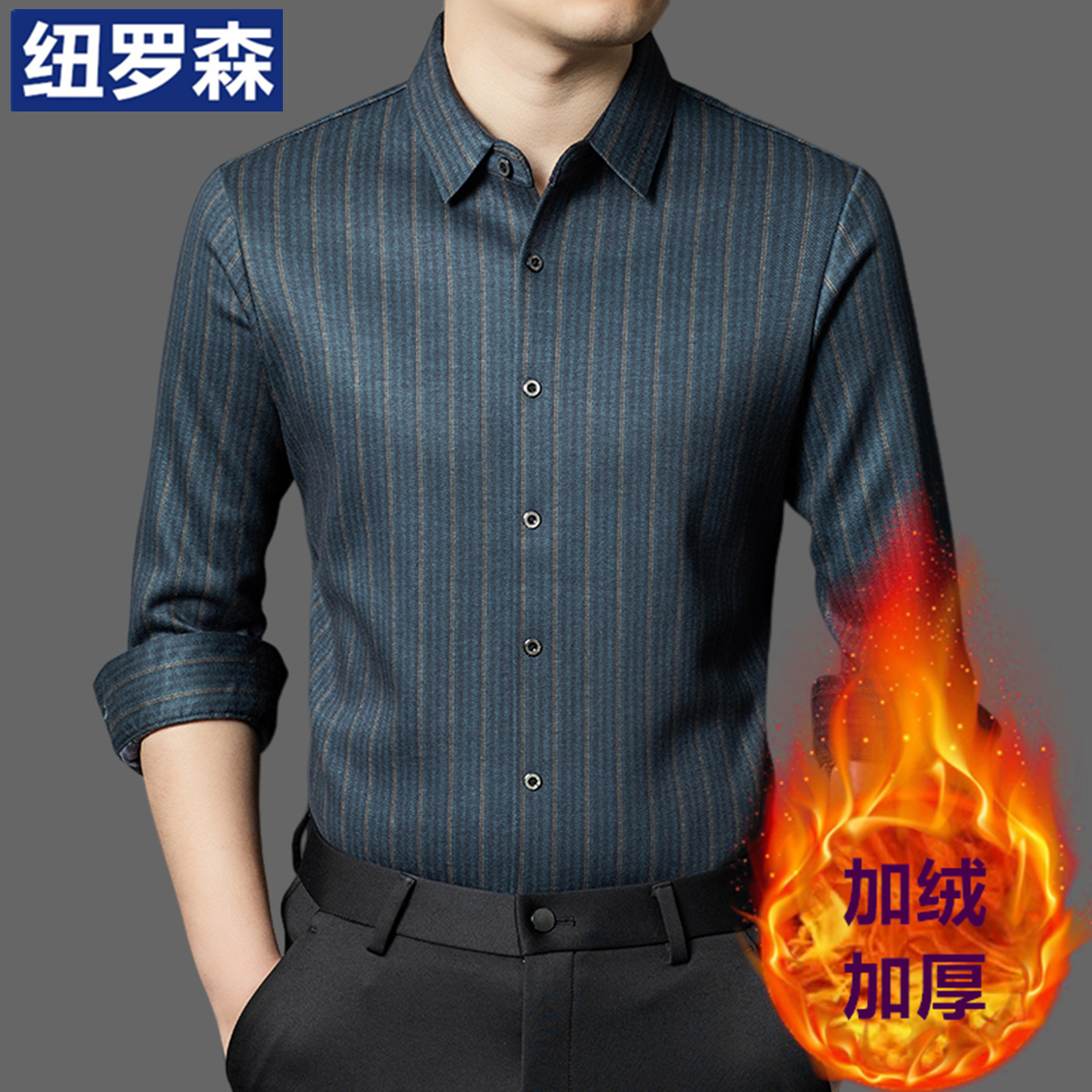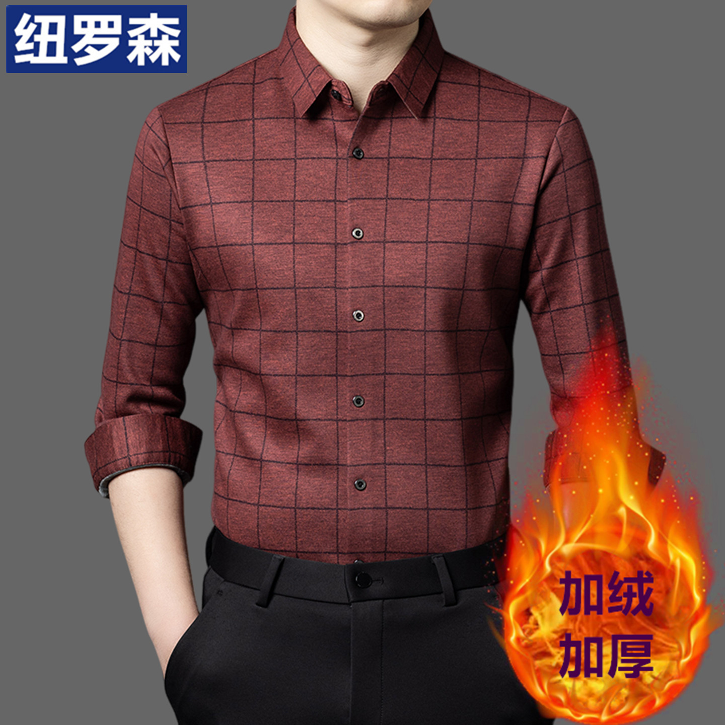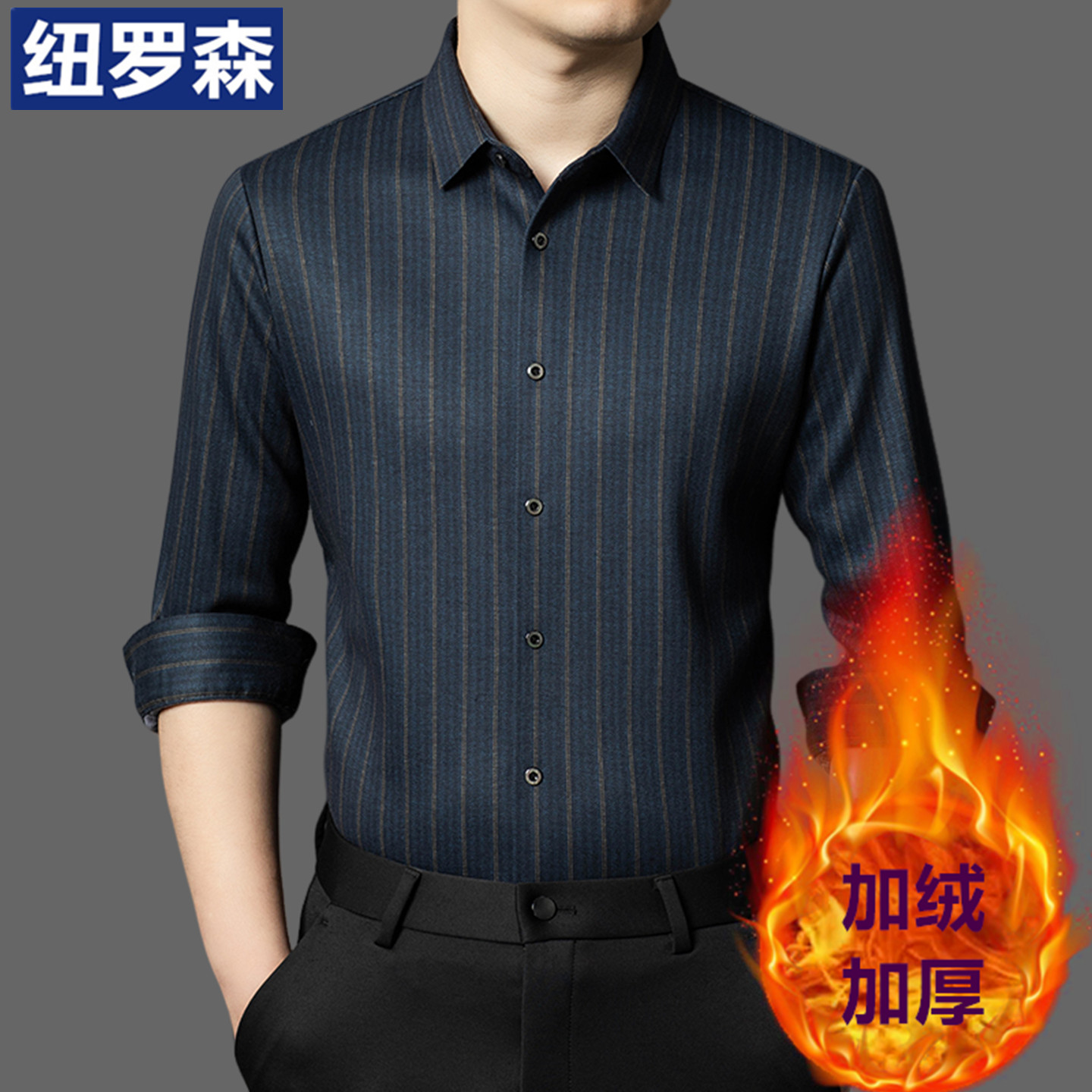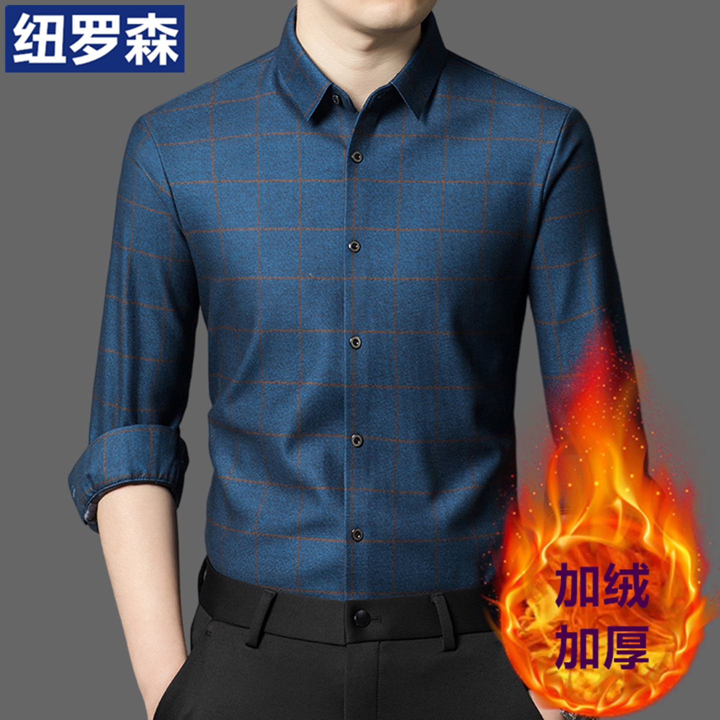 冬季高端羊毛加绒衬衫男长袖商务休闲中年父亲加厚保暖衬衣男免烫