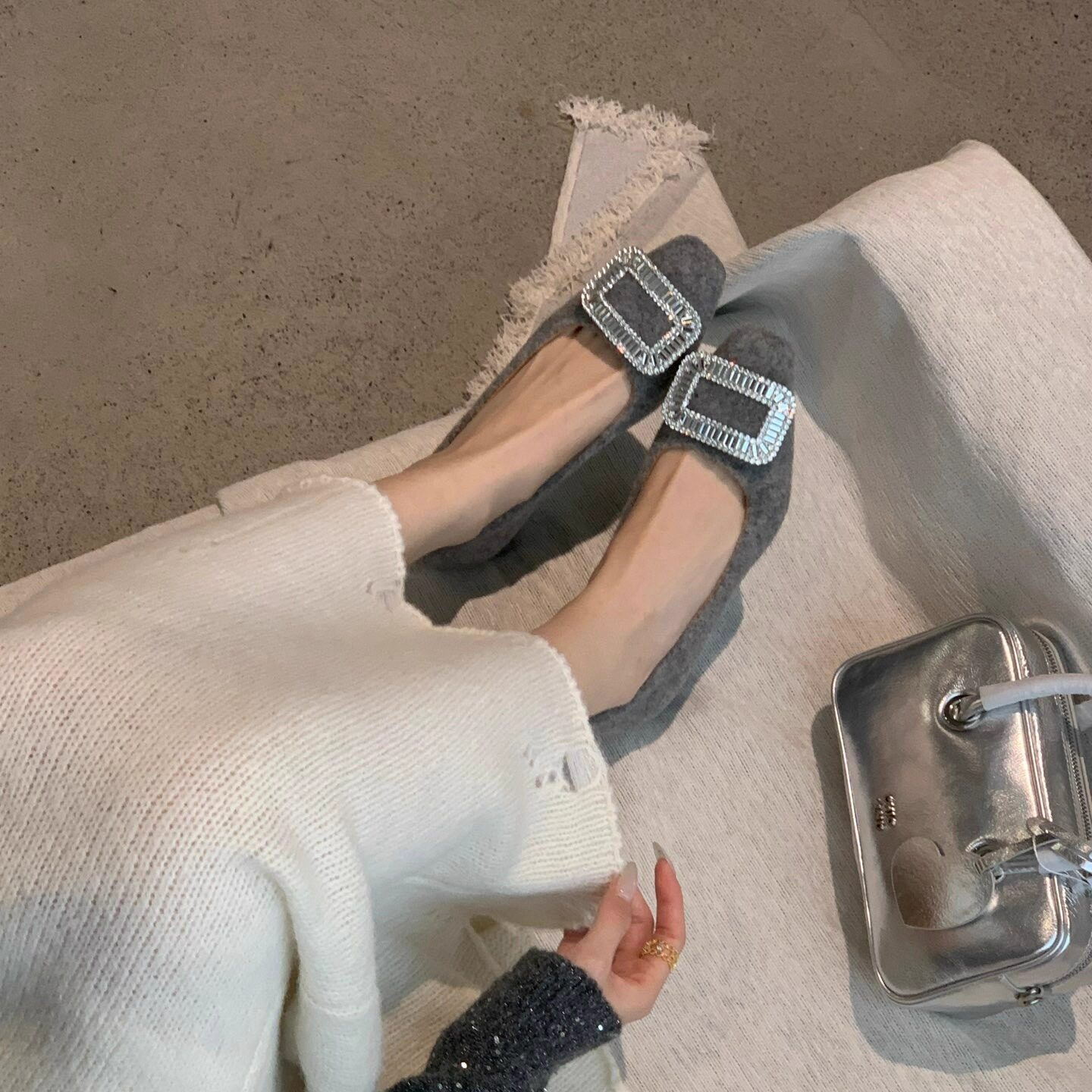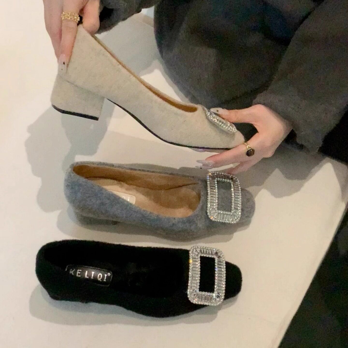 黑色水钻扣气质法式高跟鞋配裙子温柔晚晚鞋秋冬季加绒百搭女单鞋