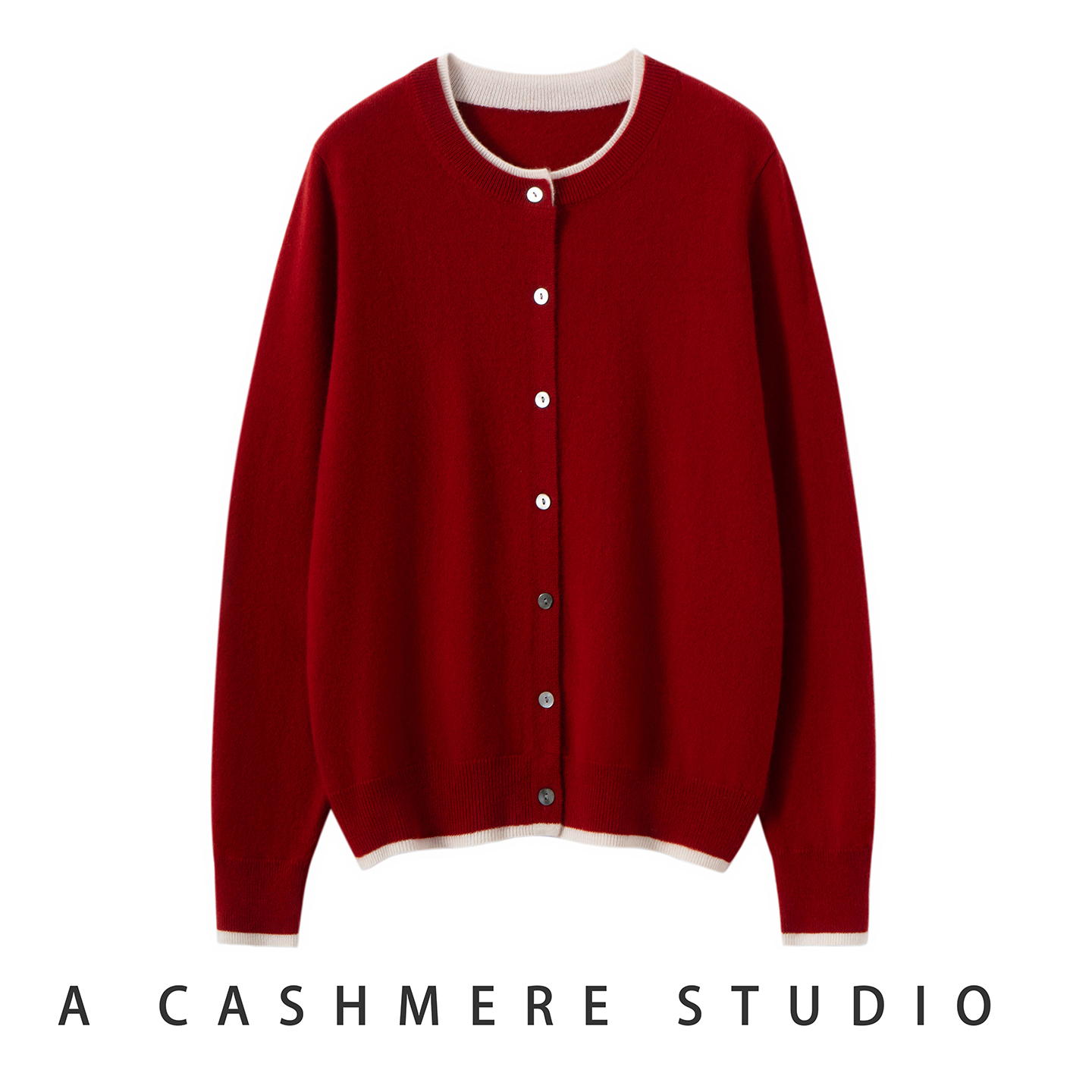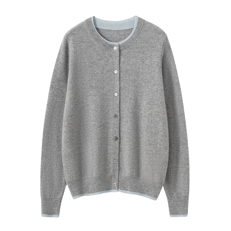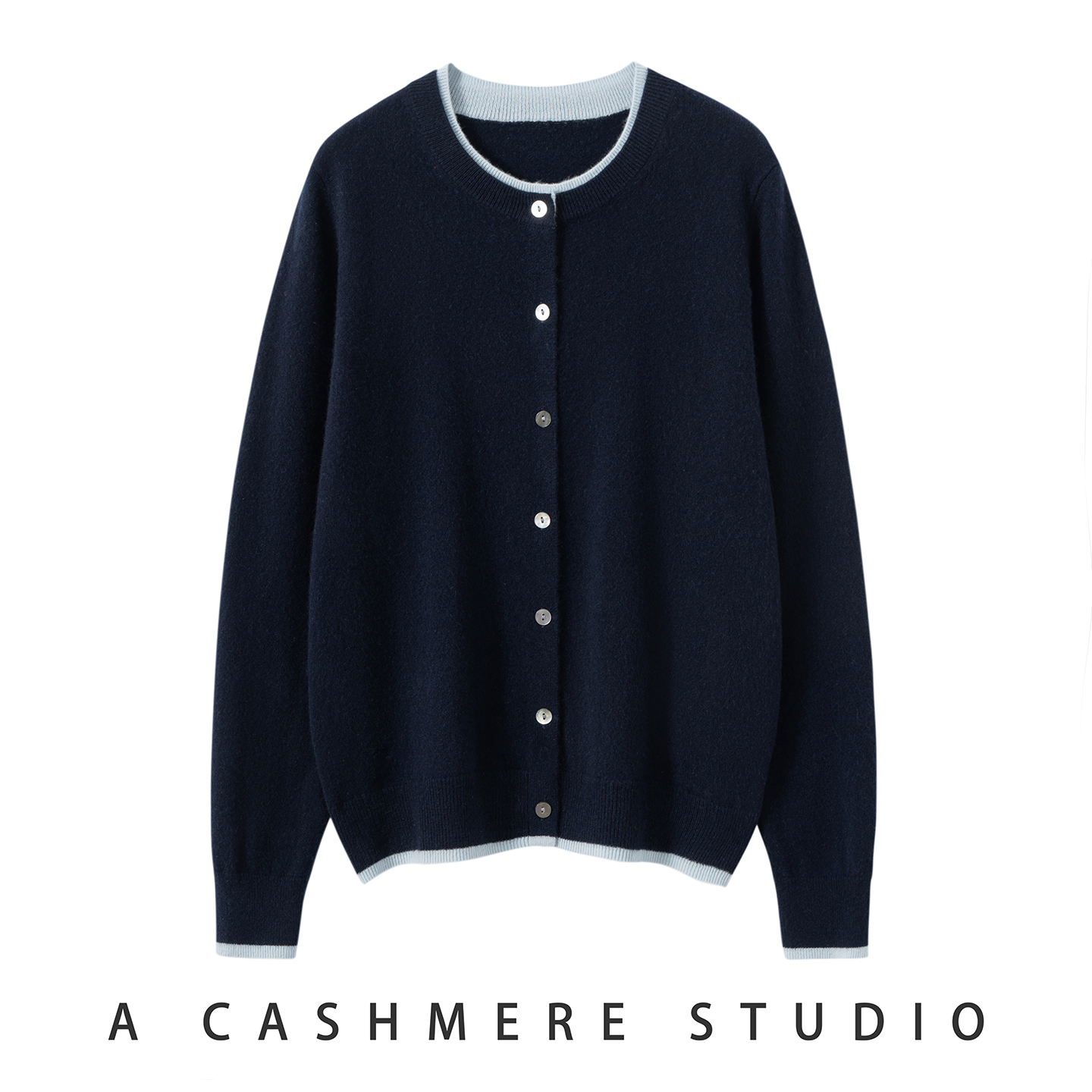 2025秋冬新款100%山羊绒开衫女圆领拼色假两件宽松毛衣外套针织衫