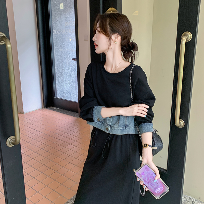 官网女装夏易菲实拍设计感撞色拼接假两件牛仔连衣裙2025年秋季新