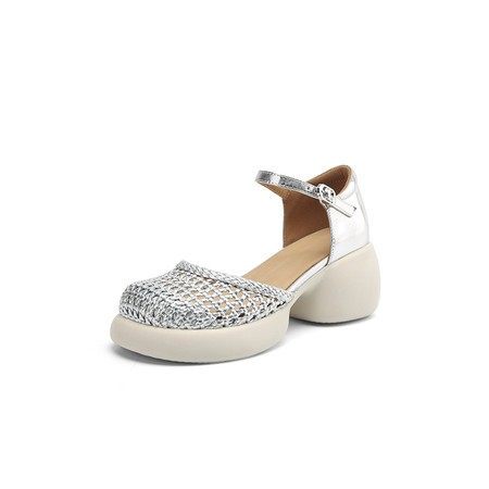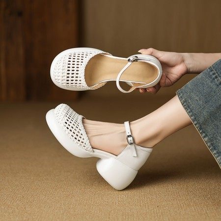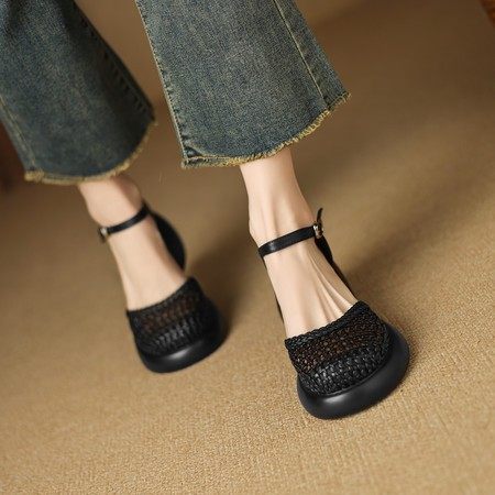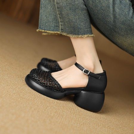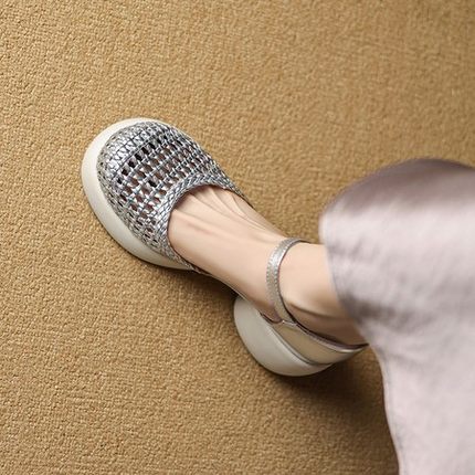 真皮编织包头凉鞋女2025新款复古厚底松糕鞋一字扣带中空高跟女鞋