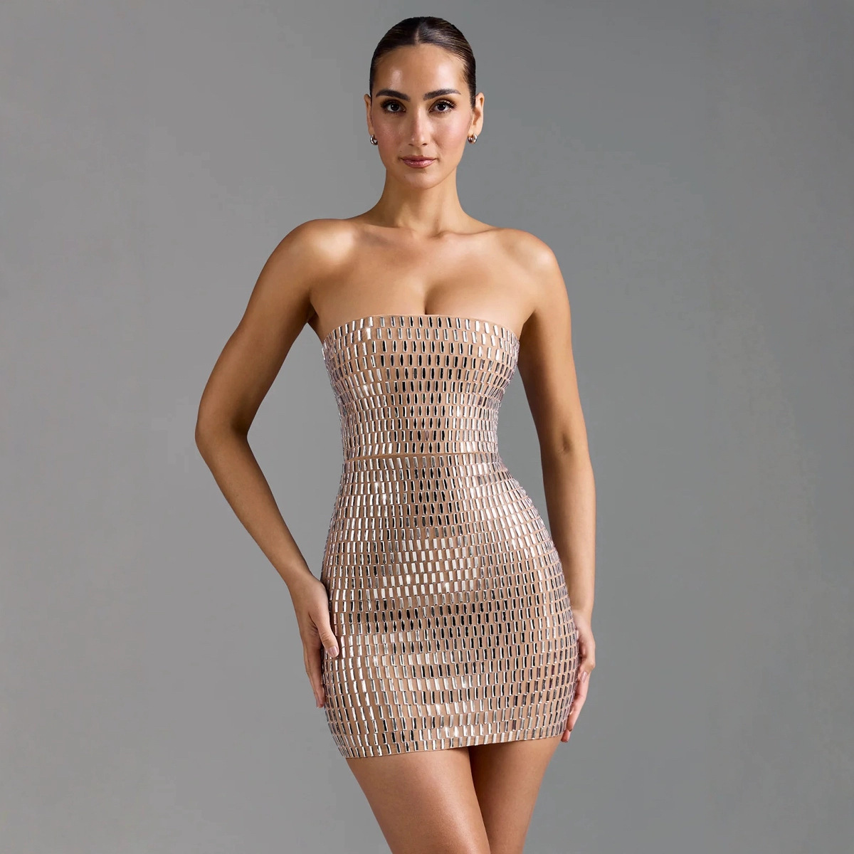 独立站闪亮水钻弹性网面短款抹胸连衣裙时尚热辣派对晚宴礼服