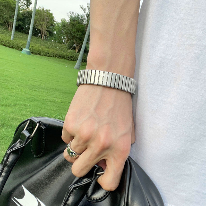 欧美钛钢冷淡手链男百搭光面表带手镯弹力小众金属情侣手环个性
