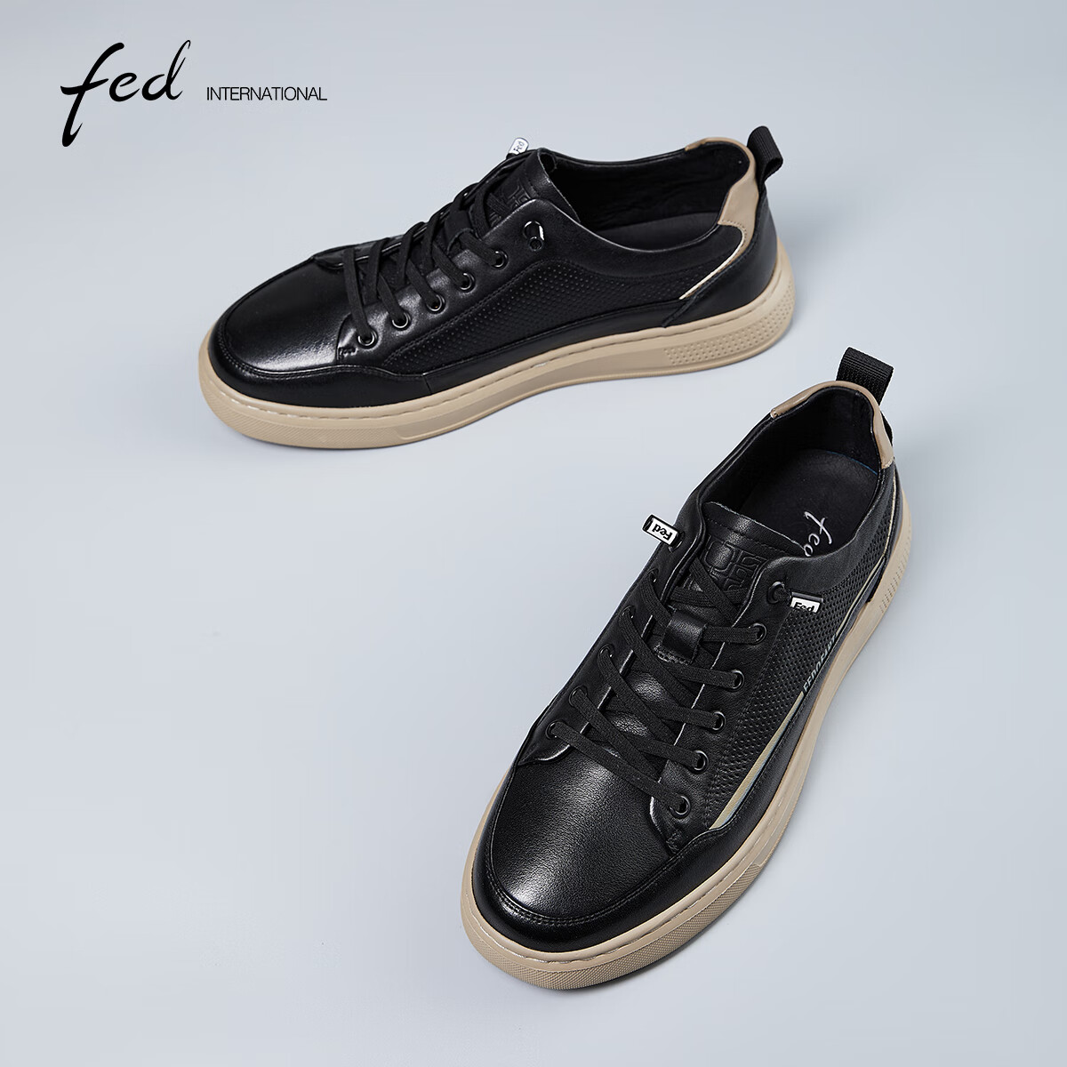 FED真皮男鞋夏头层牛皮冲孔透气平底软底运动休闲鞋男板鞋小白鞋