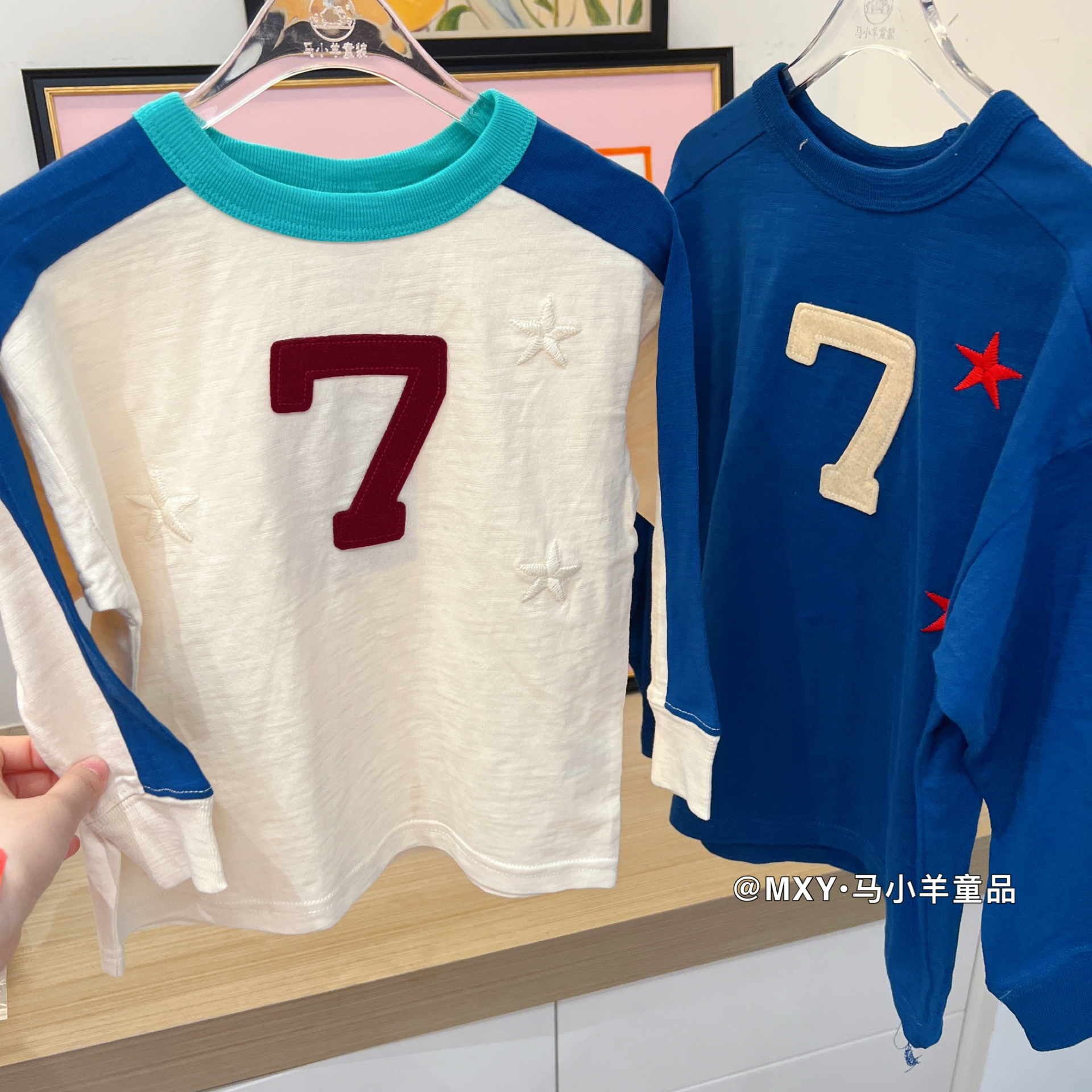 潮日系儿童长袖 春季新款男女儿童 7号刺绣星星竹节棉拼色上衣T袖