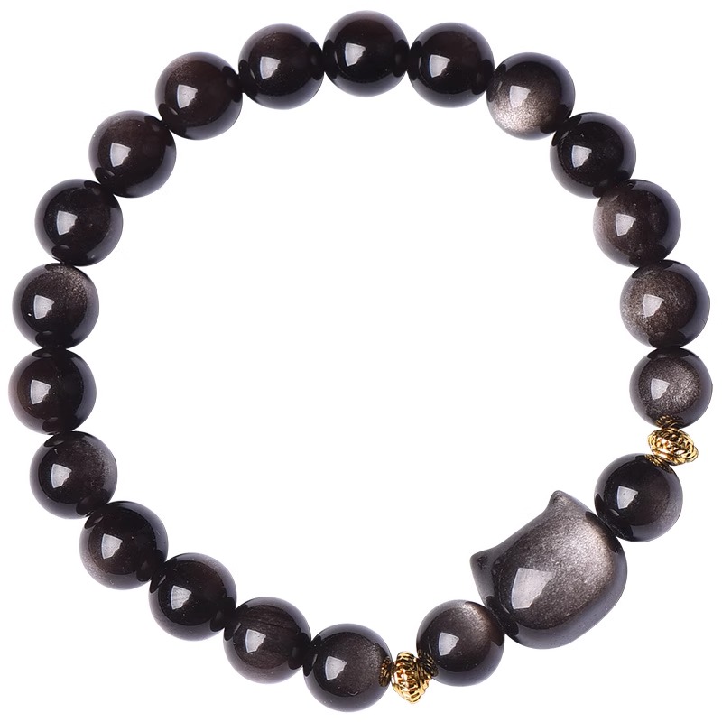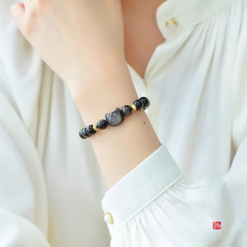 黑曜石手链女猫头金耀石猫眼石银曜石手串男士情侣款一对生日礼物