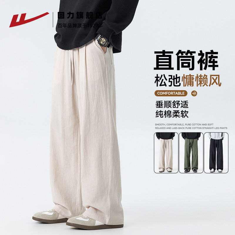 回力纯棉裤子男款2026春夏新款直筒运动裤宽松亚麻长裤垂感休闲裤
