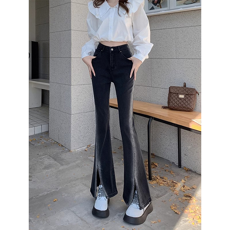 300斤胖mm韩版黑色渐变微喇牛仔裤女大码女装开叉裤子显瘦阔腿裤