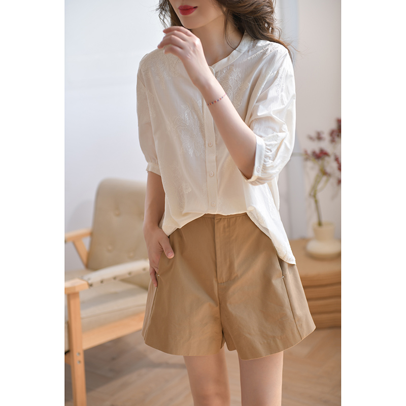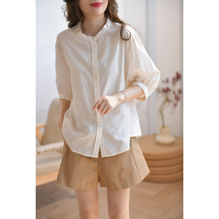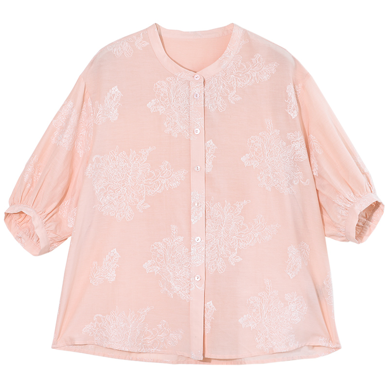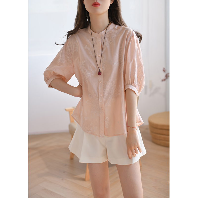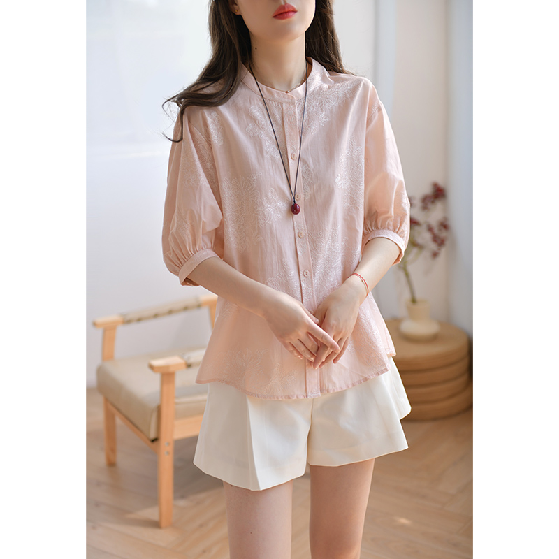 GESGOO重工刺绣真丝棉衬衫女夏季2025新款减龄粉色气质上衣设计感